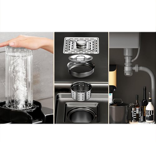 W komplecie otrzymujesz dozownik na mydło, ociekacz, deskę do krojenia, pojemnik z odpływem. Wszystkie dodatki zwiększają funkcjonalność zlewozmywaka, czyniąc codzienną pracę w kuchni wygodniejszą i bardziej efektywną.