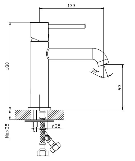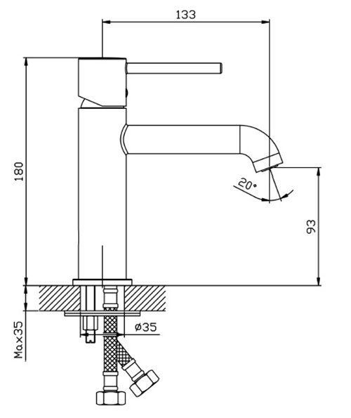 Wysokość całkowita: 180 mm; zasięg wylewki: 133 mm; wysokość wylewki: 93 mm; otwór montażowy: Ø35 mm.