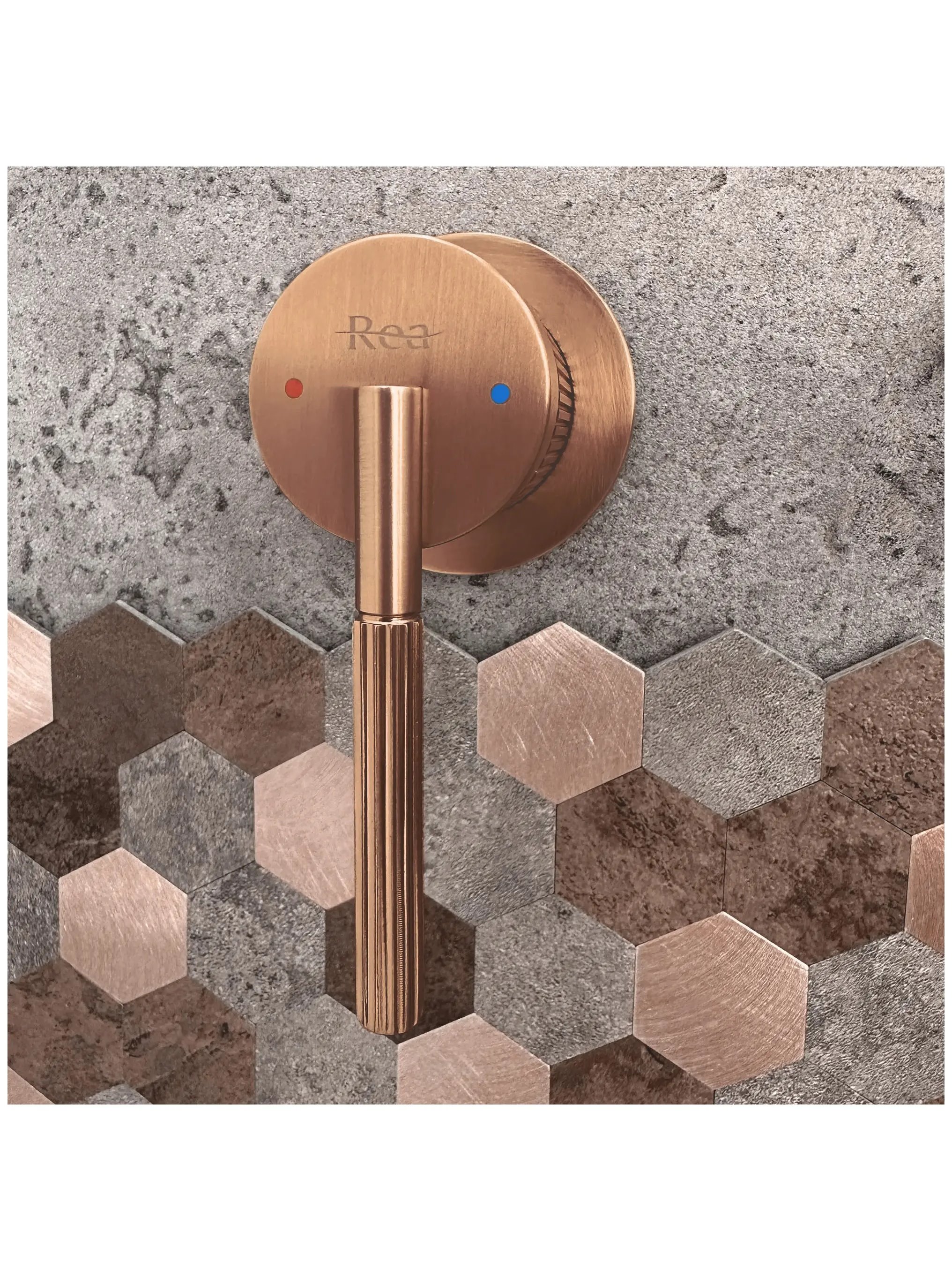 Bateria umywalkowa podtynkowa Rea Argon Miedź Szczotkowana to idealne rozwiązanie dla nowoczesnych łazienek, w których liczy się harmonia pomiędzy estetyką a funkcjonalnością. Jej elegancka forma z ryflowanym uchwytem i wykończeniem w odcieniu miedzi szczotkowanej nadaje wnętrzu wyjątkowego, luksusowego charakteru.Model wykonano z wysokiej jakości mosiądzu, który zapewnia trwałość, odporność na korozję i wieloletnie, bezawaryjne użytkowanie. Zastosowana innowacyjna powłoka PVD (Physical Vapour Deposition) nadaje powierzchni wysoką odporność na zarysowania, wilgoć i ścieranie — nawet kilkunastokrotnie wyższą niż w przypadku tradycyjnych metod galwanicznych.