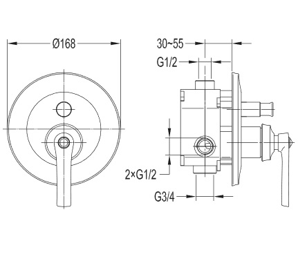Dwa wejścia 1/2" (na wodę ciepłą i zimną), dwa wyjścia (1/2" i 3/4") wody zmieszanej