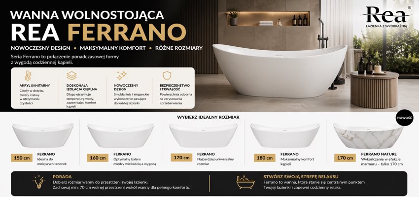 Jeśli wpisujesz w Google frazę wanna wolnostojąca i trafiasz na modele Rea Ferrano, to jesteś w dobrym miejscu. To jedna z najczęściej wybieranych serii wanien do nowoczesnych łazienek. W tym poradniku pokazujemy konkretnie: czym różnią się modele Ferrano, jak dobrać rozmiar i który wariant sprawdzi się najlepiej w Twoim wnętrzu.