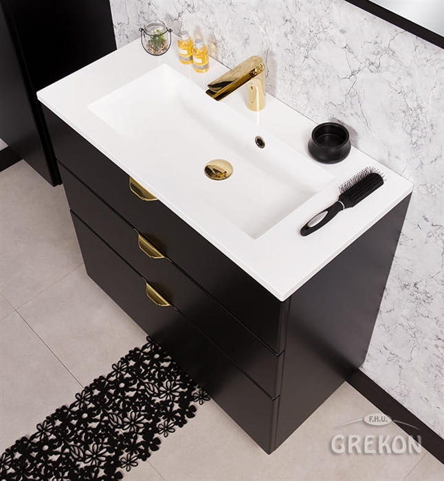 Szafka łazienkowa w czarnym matowym kolorze i złotymi uchwytami wraz z prostokątną białą dolomitową umywalką z serii VICTA. Szafka posiada trzy szuflady. Umywalka posiada otwór na baterię.