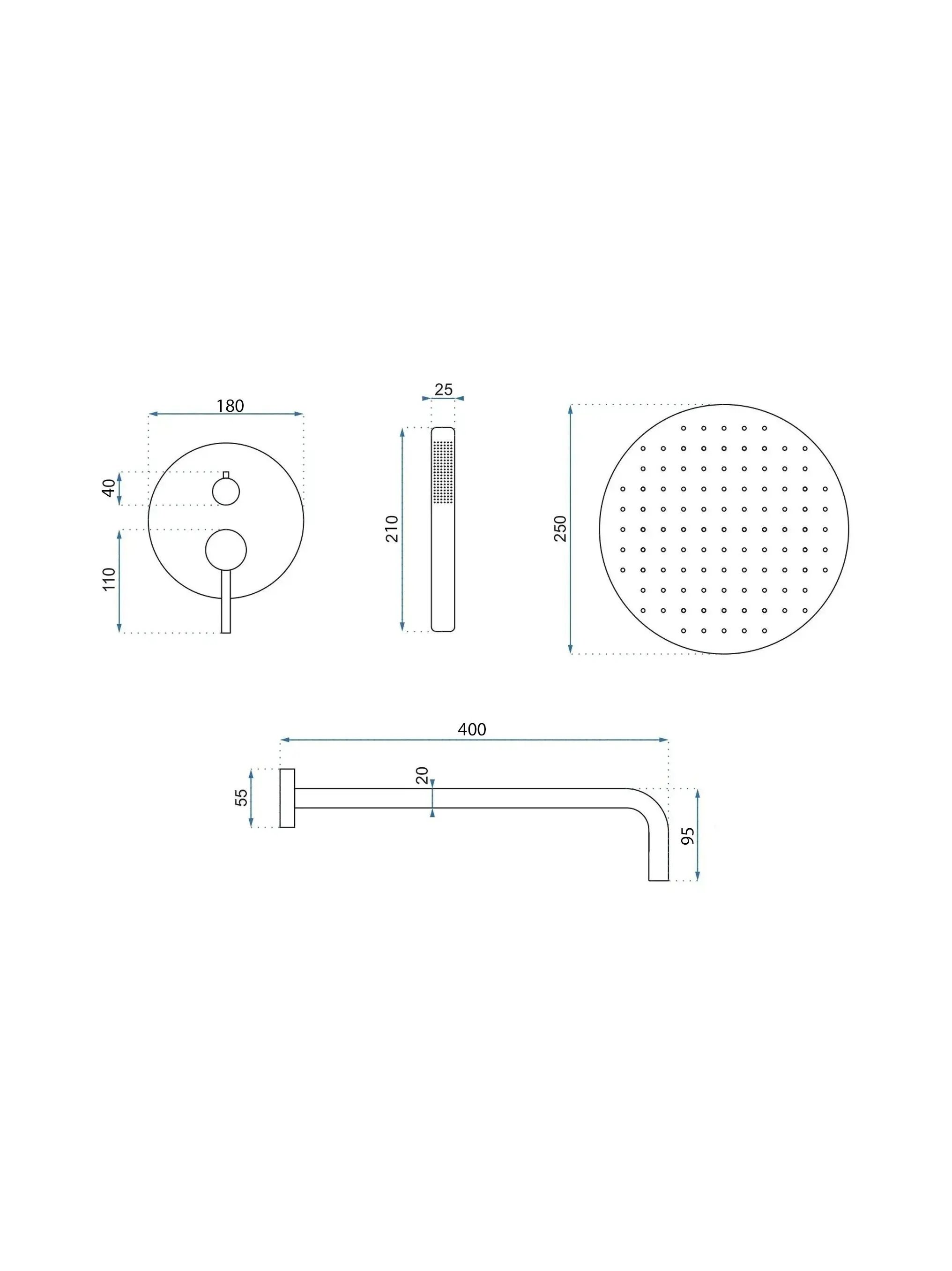 - Skład zestawu: Bateria, deszczownica, ramię do deszczownicy, wąż 1500 mm, słuchawka, uchwyt na słuchawkę, maskownice