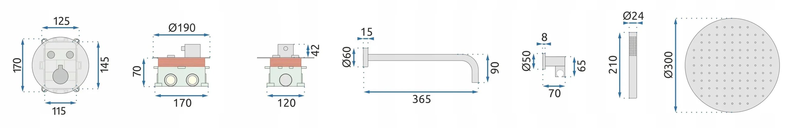 Skład zestawu: Bateria, deszczownica, ramię do deszczownicy, wąż 1500 mm, słuchawka, uchwyt na słuchawkę, maskownice, box podtynkowy