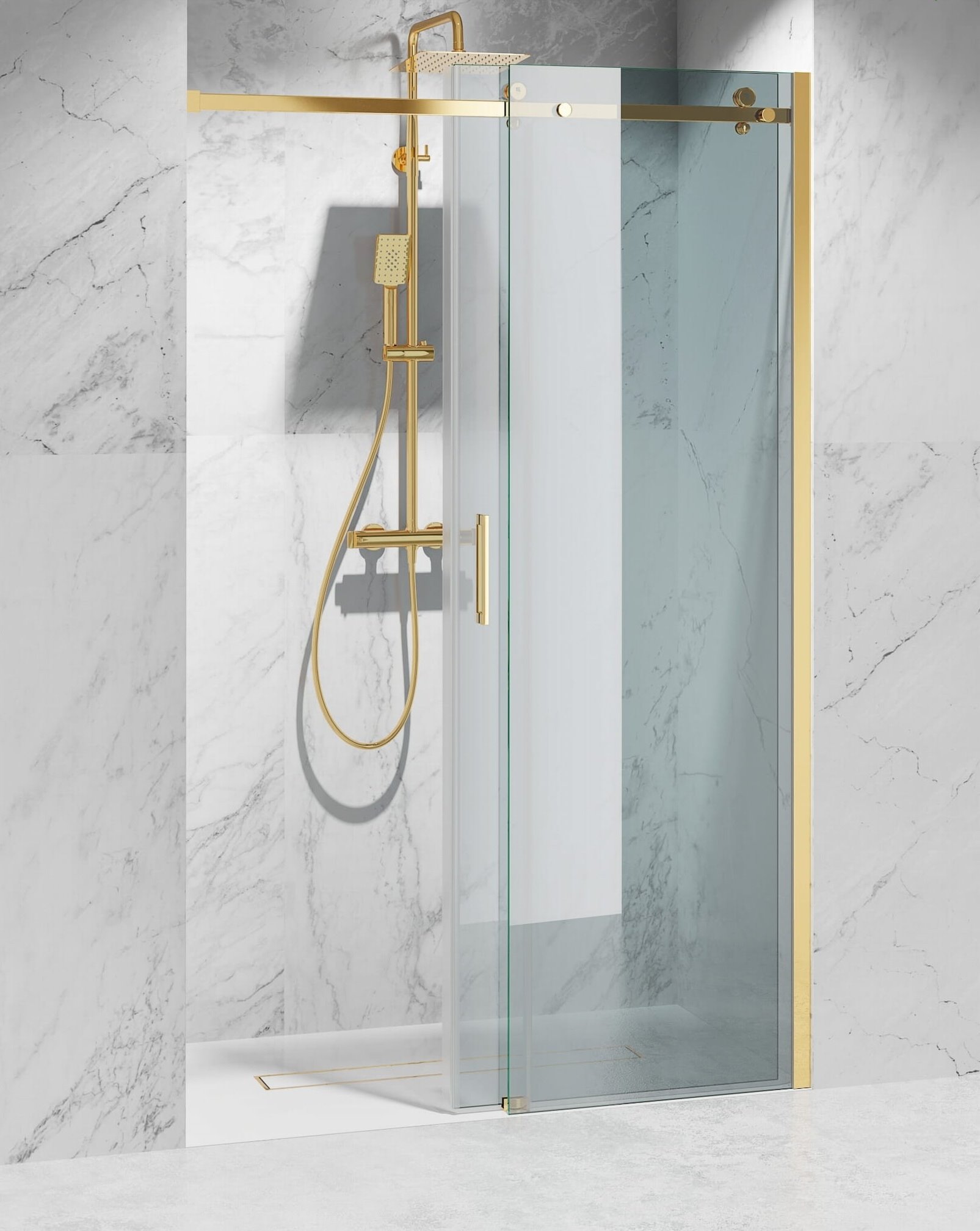 Opis produktu Drzwi prysznicowe rozsuwane prawe/lewe do wnęki 102-111 cm szkło 8mm przeźroczyste profile złoty mat Swiss Liniger