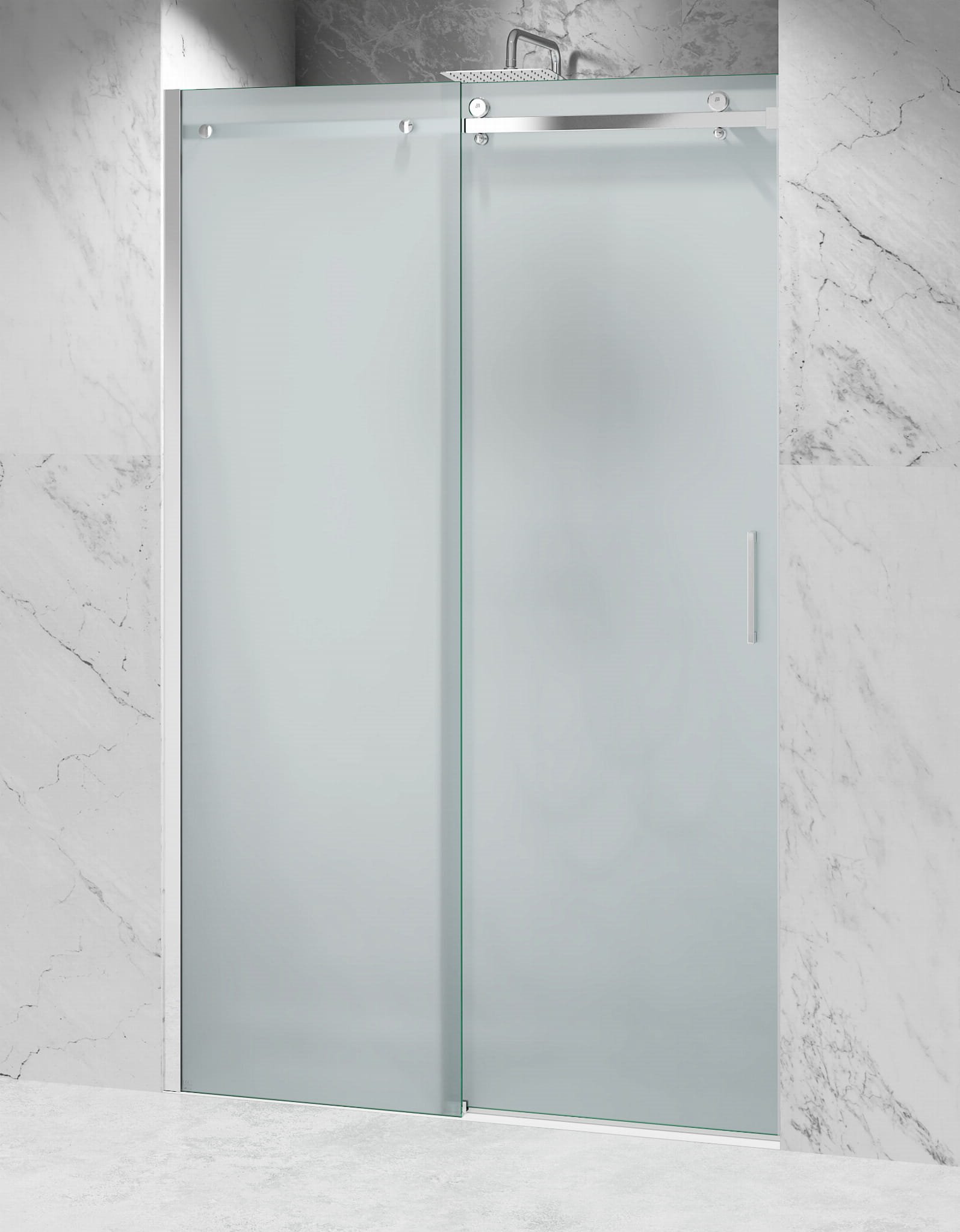 Opis produktu Drzwi prysznicowe rozsuwane prawe/lewe do wnęki 112-121 cm szkło 8mm mleczne profile chrom Swiss Liniger