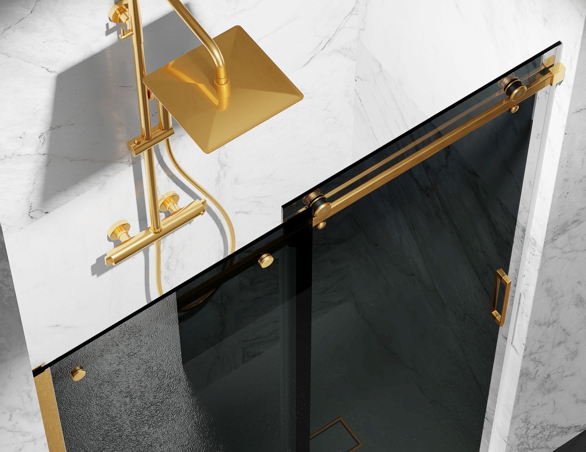 Opis produktu Drzwi prysznicowe rozsuwane prawe/lewe do wnęki 121-127 cm szkło 8mm grafitowe profile złoty mat Swiss Liniger