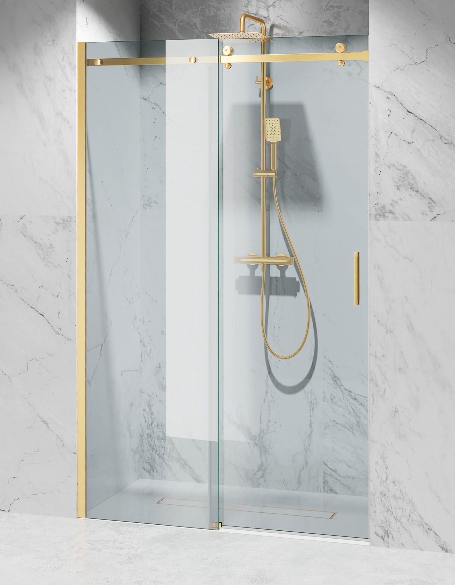 Opis produktu Drzwi prysznicowe rozsuwane prawe/lewe do wnęki 131-137 cm szkło 8mm przeźroczyste profile złoty mat Swiss Liniger