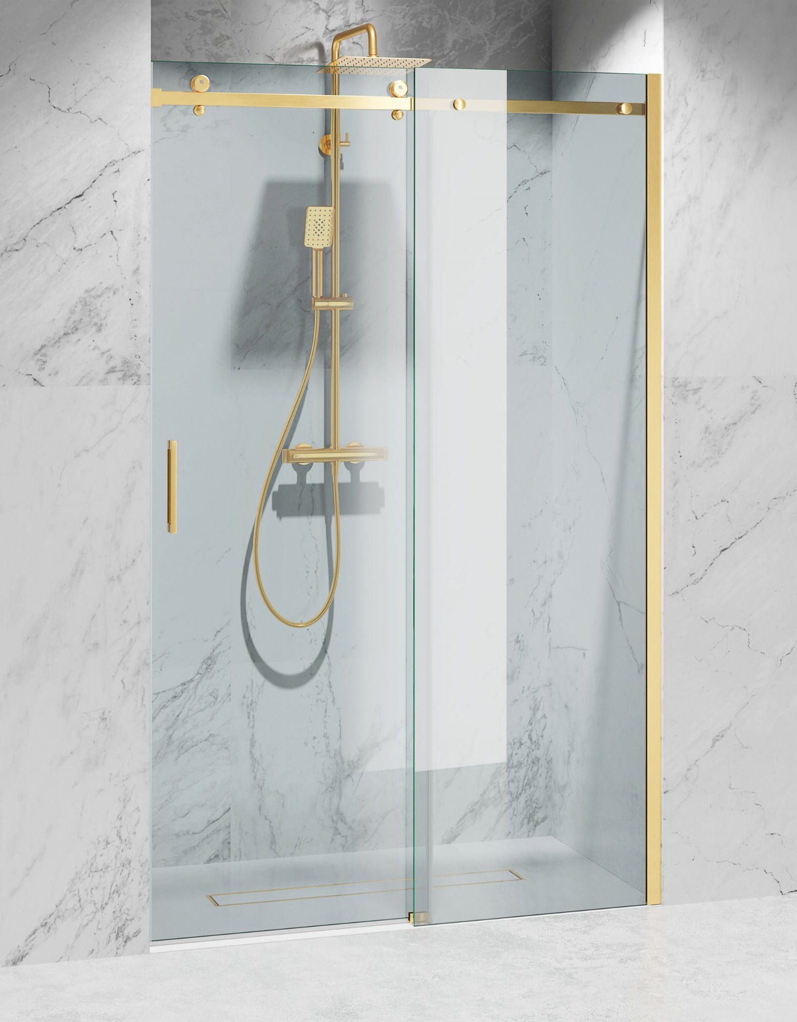 Opis produktu Drzwi prysznicowe rozsuwane prawe/lewe do wnęki 132-141 cm szkło 8mm przeźroczyste profile złoty mat Swiss Liniger