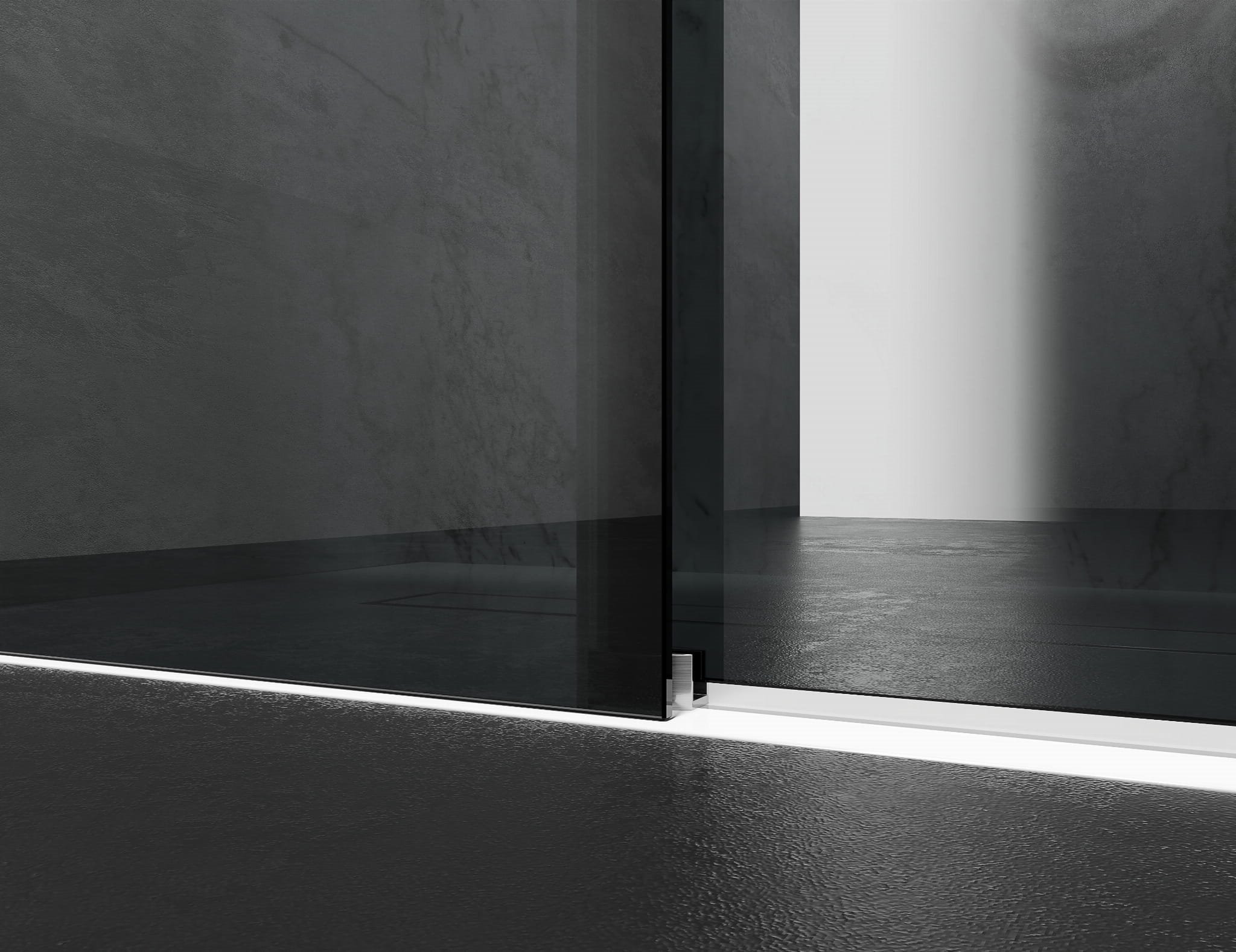 Drzwi można zamontować klasycznie na brodziku lub bezpośrednio na posadzce z odwodnieniem liniowym. Regulowane profile ułatwiają instalację i pozwalają na precyzyjne dopasowanie konstrukcji do wnęki.