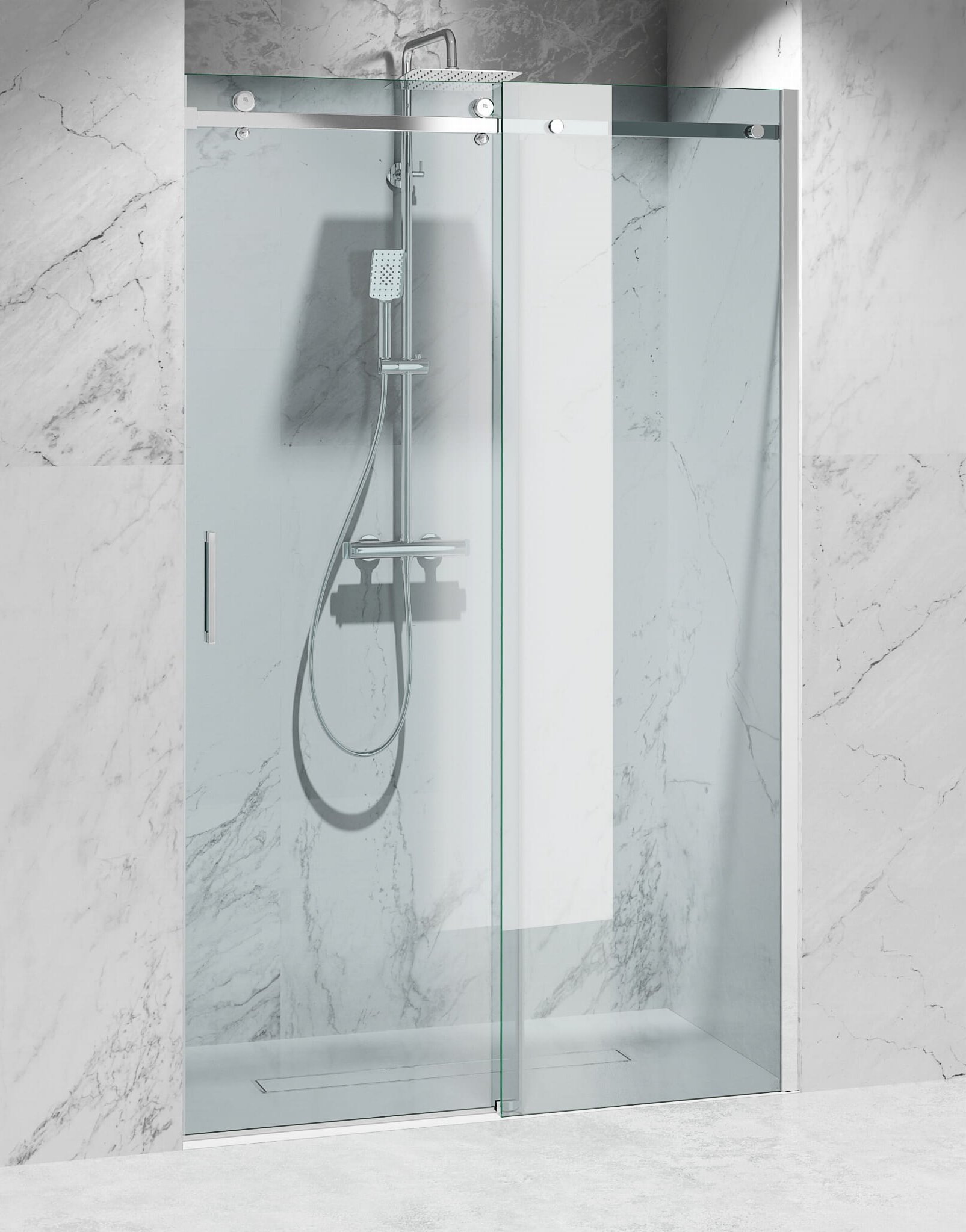 Opis produktu Drzwi prysznicowe rozsuwane prawe/lewe do wnęki 142-151 cm szkło 8mm przeźroczyste profile chrom Swiss Liniger