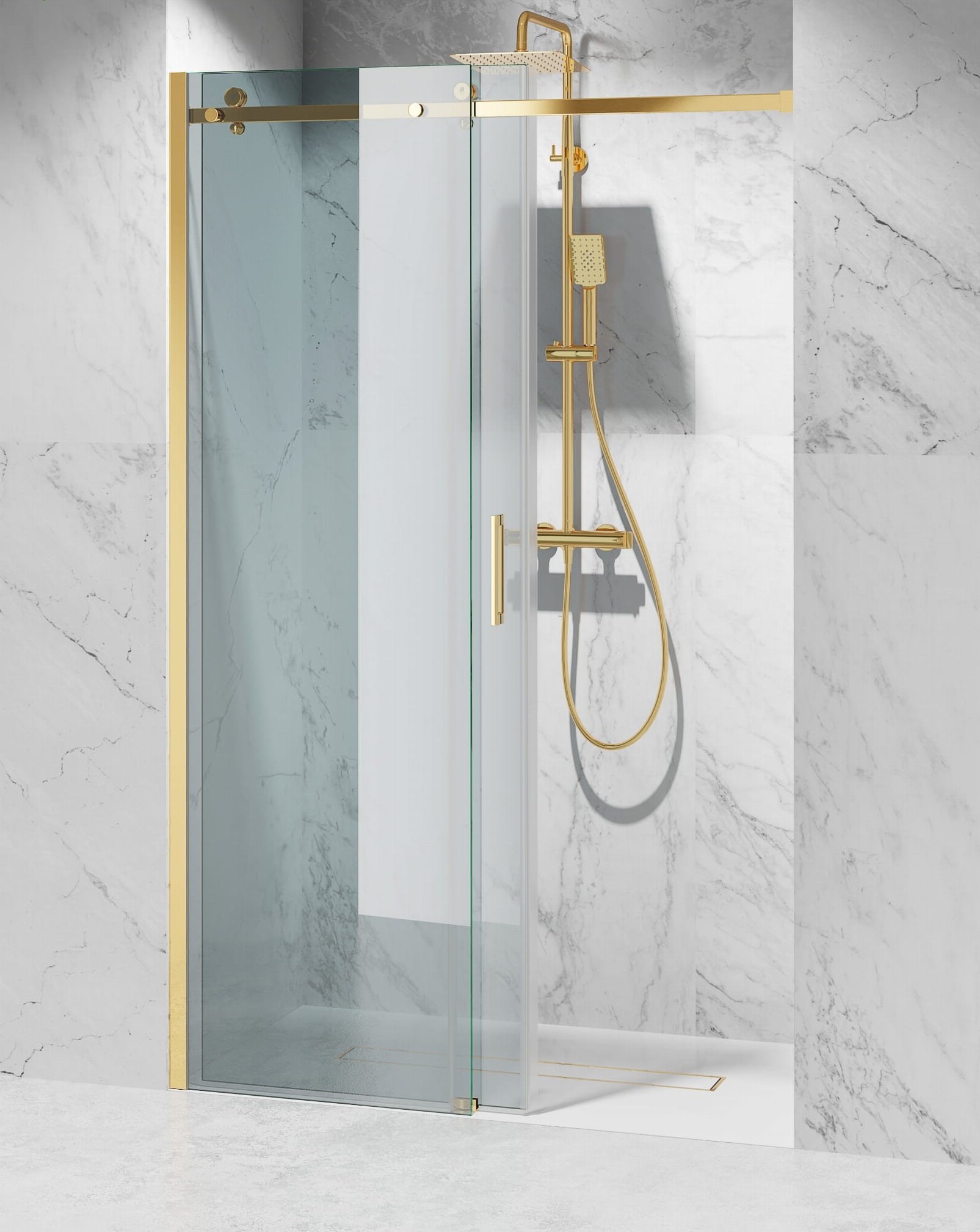 Opis produktu Drzwi prysznicowe rozsuwane prawe/lewe do wnęki 92-101 cm szkło 8mm przeźroczyste profile złoty mat Swiss Liniger