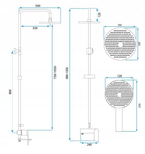 - Skład zestawu: Bateria, deszczownica, ramię do deszczownicy, wylewka, wąż 1500 mm, słuchawka, uchwyt na słuchawkę, maskownice