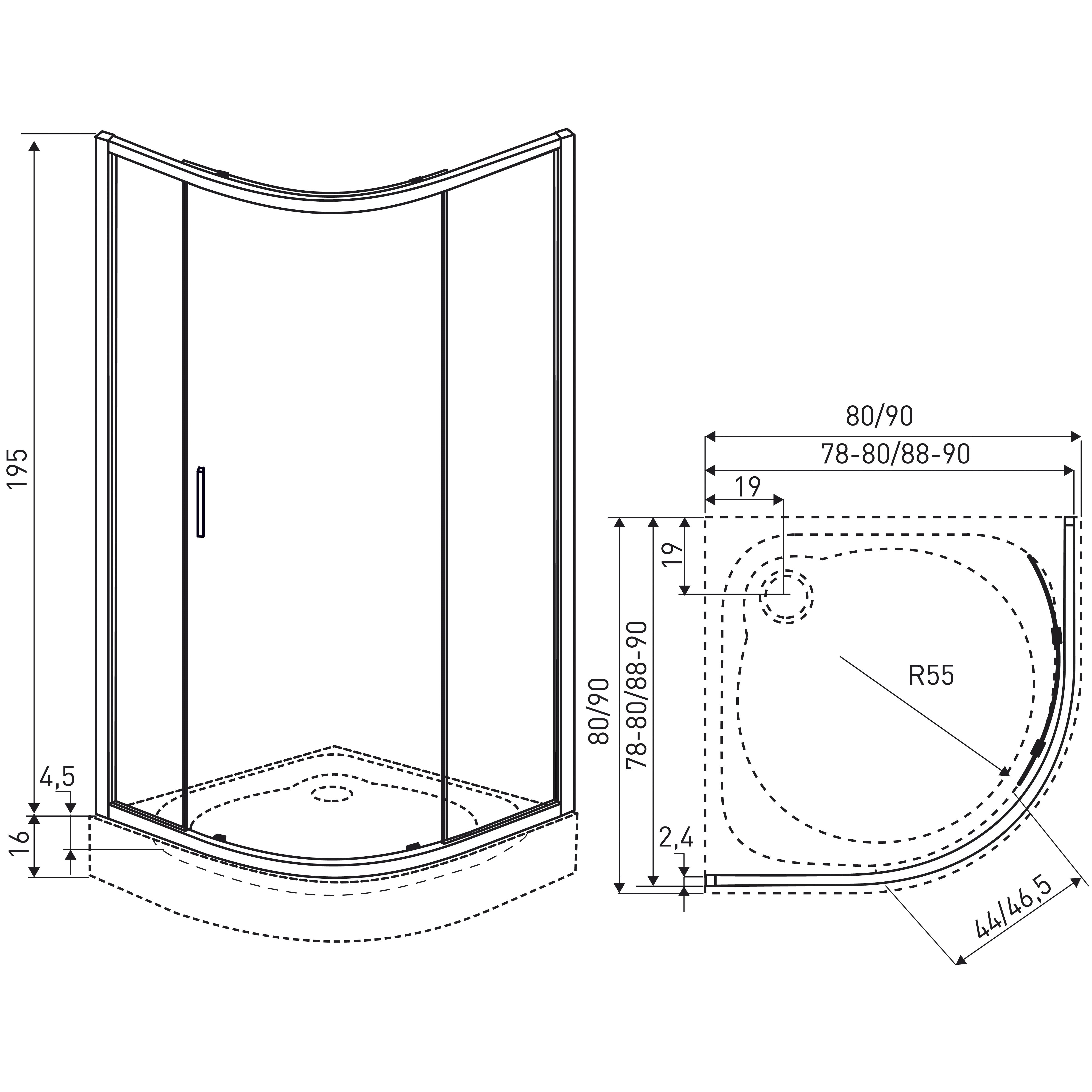 Wymiary: 80 cm x 80 cm x 195 cm wysokość bez brodzika i 211 cm wysokość z brodzkiem.
