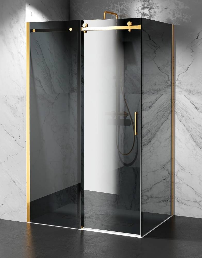 Grafitowe szkło hartowane 8 mm pokryte jest powłoką hydrofobową, która chroni przed osadzaniem kamienia i ułatwia czyszczenie. Solidne aluminiowe profile w wykończeniu złoty połysk podkreślają elegancję i prestiżowy charakter kabiny, a wzmocnione rolki gwarantują cichą, płynną pracę drzwi przesuwnych.