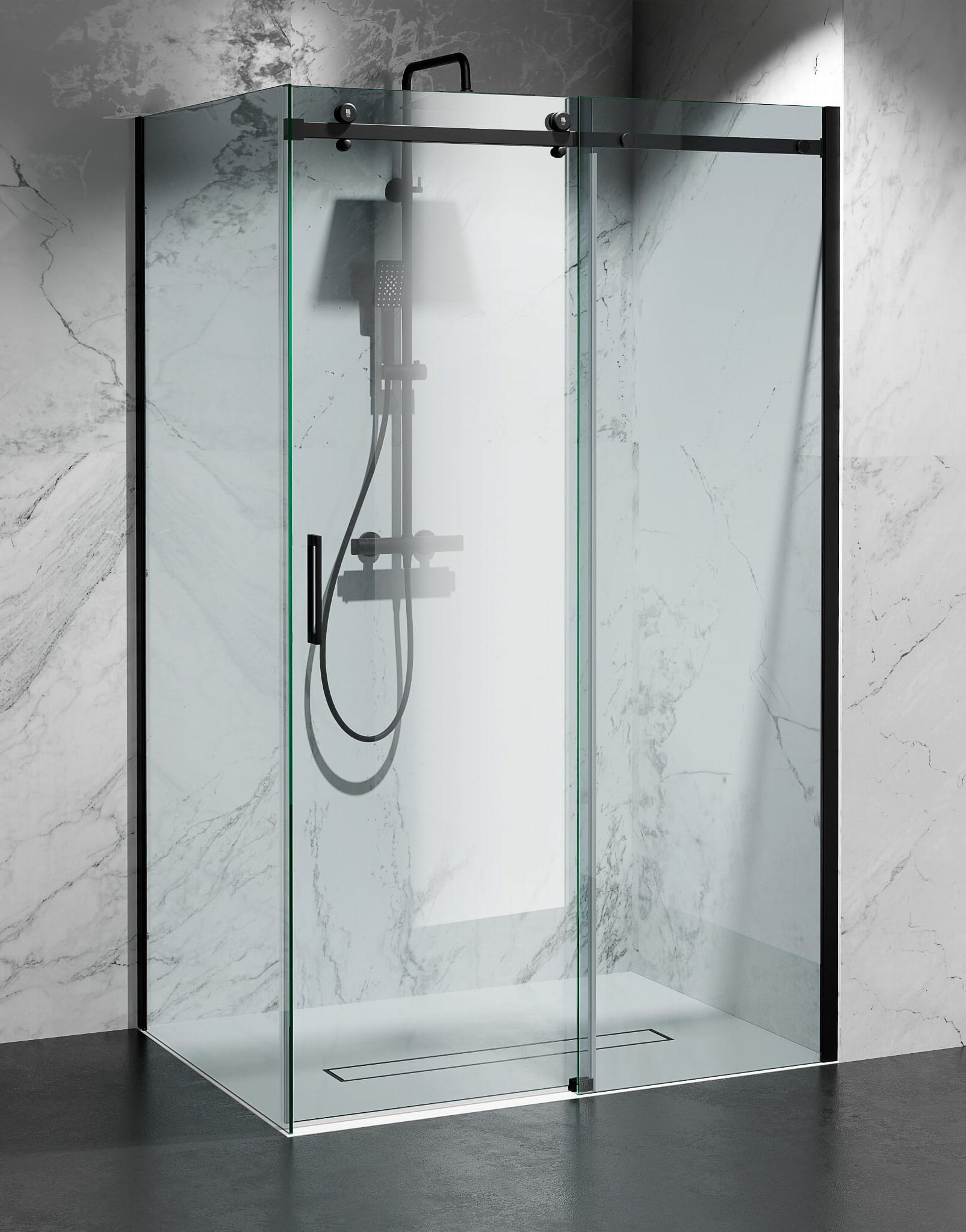 Opis produktu Kabina prysznicowa narożna 150x100 cm szkło 8mm przeźroczyste profile czarny mat Swiss Liniger