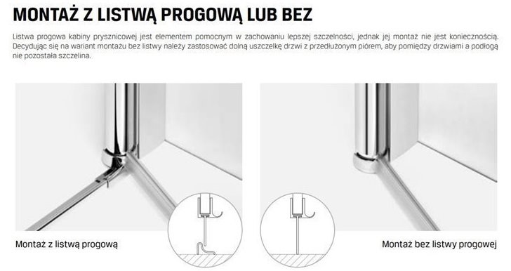 - dodatkowa uszczelka do montażu bezprogowego umożliwiająca montaż kabiny bez listwy progowej