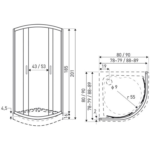 Wymiary: 80 cm x 80 cm x 185 cm wysokość bez brodzika i 201cm wysokość z brodzkiem.