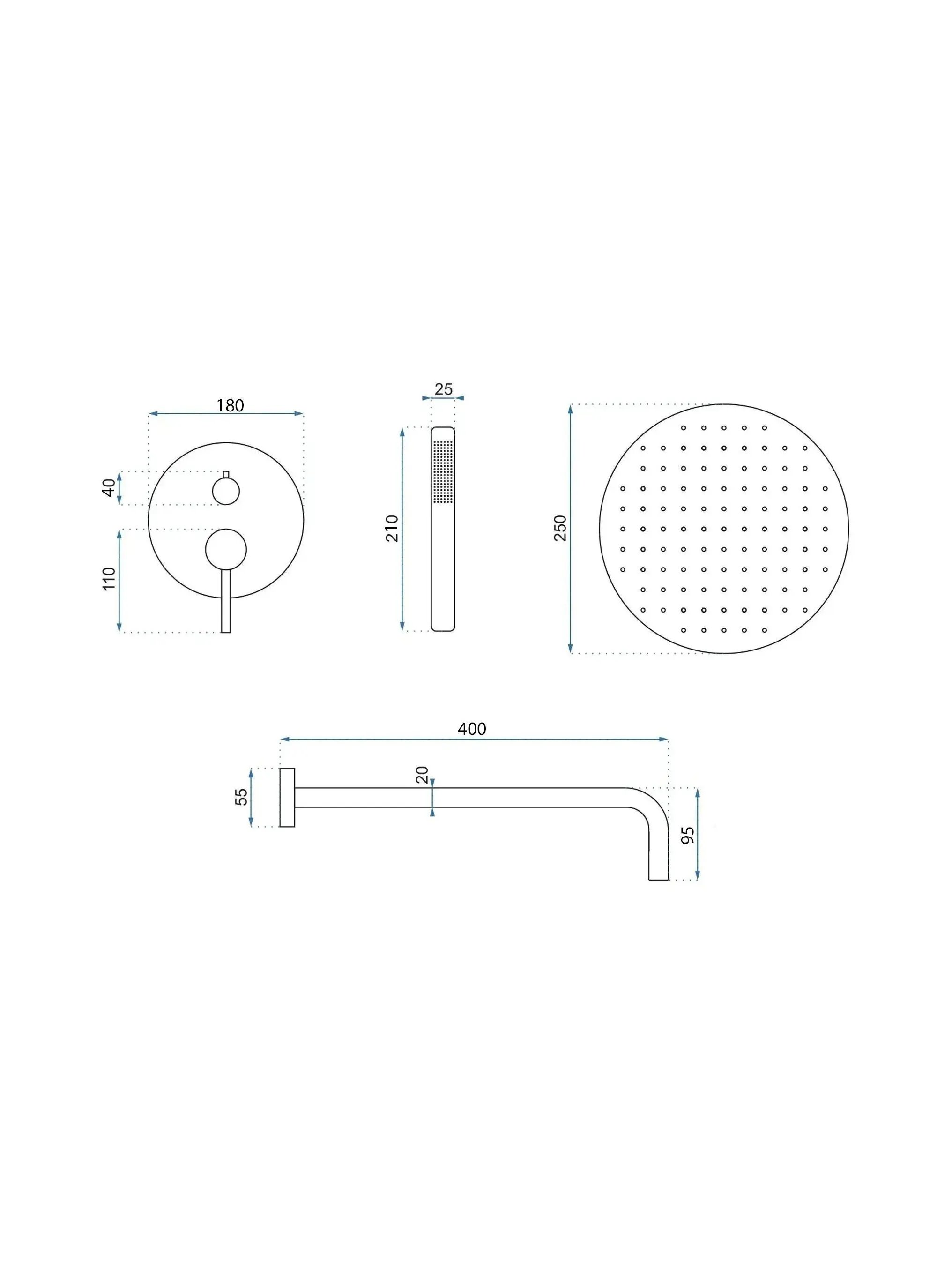- Skład zestawu: Bateria, deszczownica, ramię do deszczownicy, wąż 1500 mm, słuchawka, uchwyt na słuchawkę, maskownice, box podtynkowy