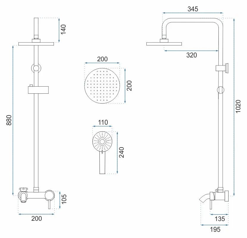 - Skład zestawu: Bateria, deszczownica, ramię do deszczownicy, wylewka, wąż 1500 mm, słuchawka, uchwyt na słuchawkę, maskownice