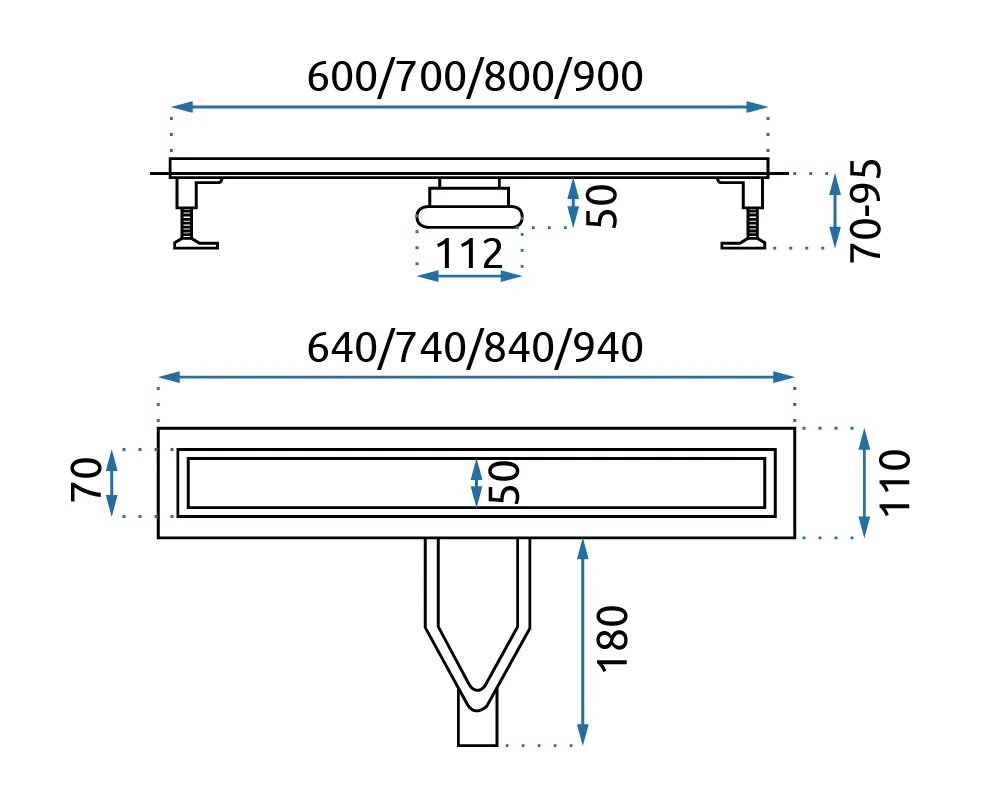 Zastosowane nóżki dają możliwość pełnej regulacji wysokości odpływu do potrzeb i możliwości montażu. Minimalny zakres regulacji to 70 mm a maksymalny 95 mm.