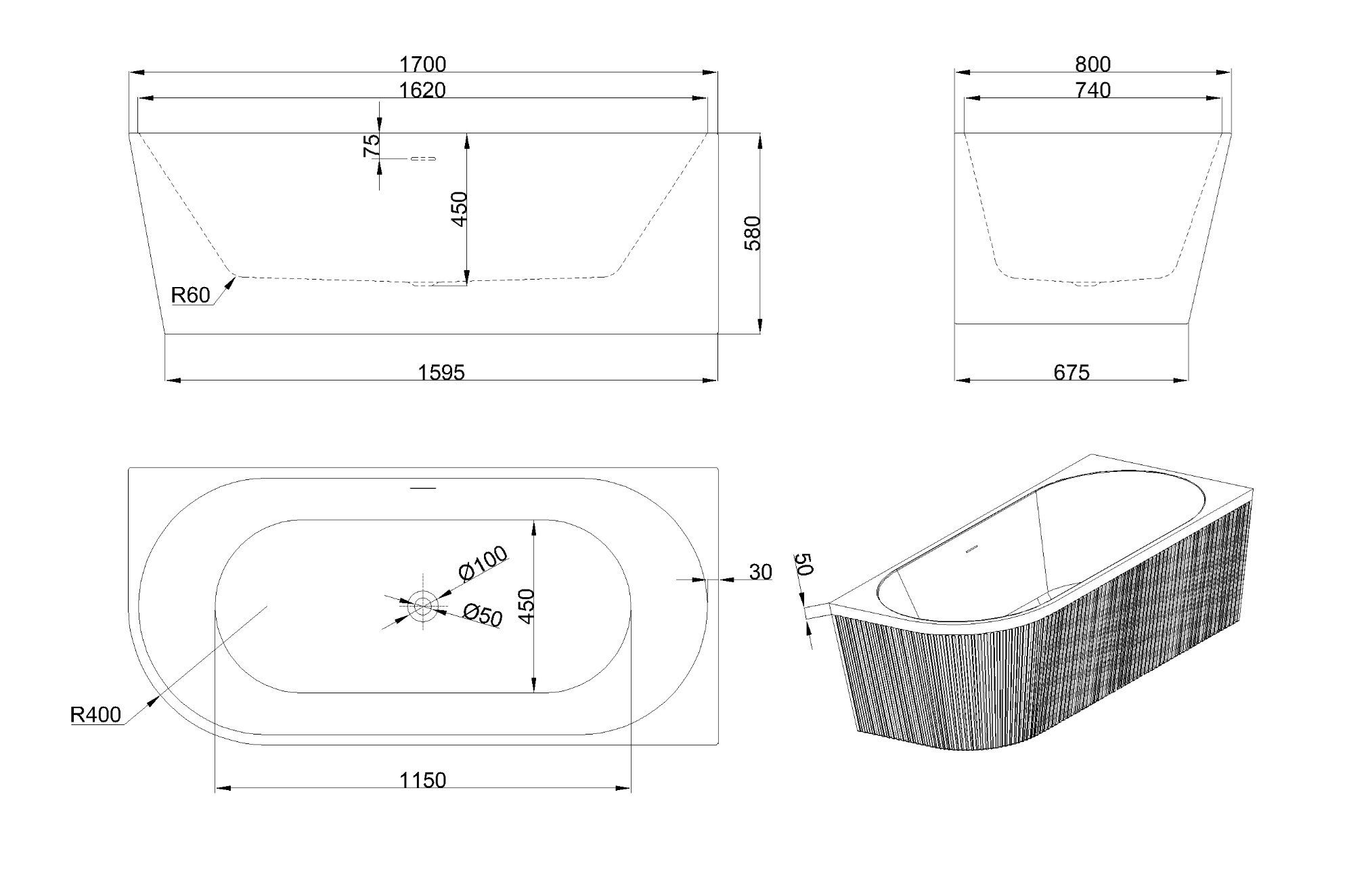 Model Glamour to wolnostojąca wanna zaprojektowana z myślą o przestronnych, dopracowanych aranżacjach łazienek. Wymiary 170 cm długości i 80 cm szerokości zapewniają wygodną pozycję kąpielową, a wysokość 58 cm umożliwia komfortowe, głębokie zanurzenie.