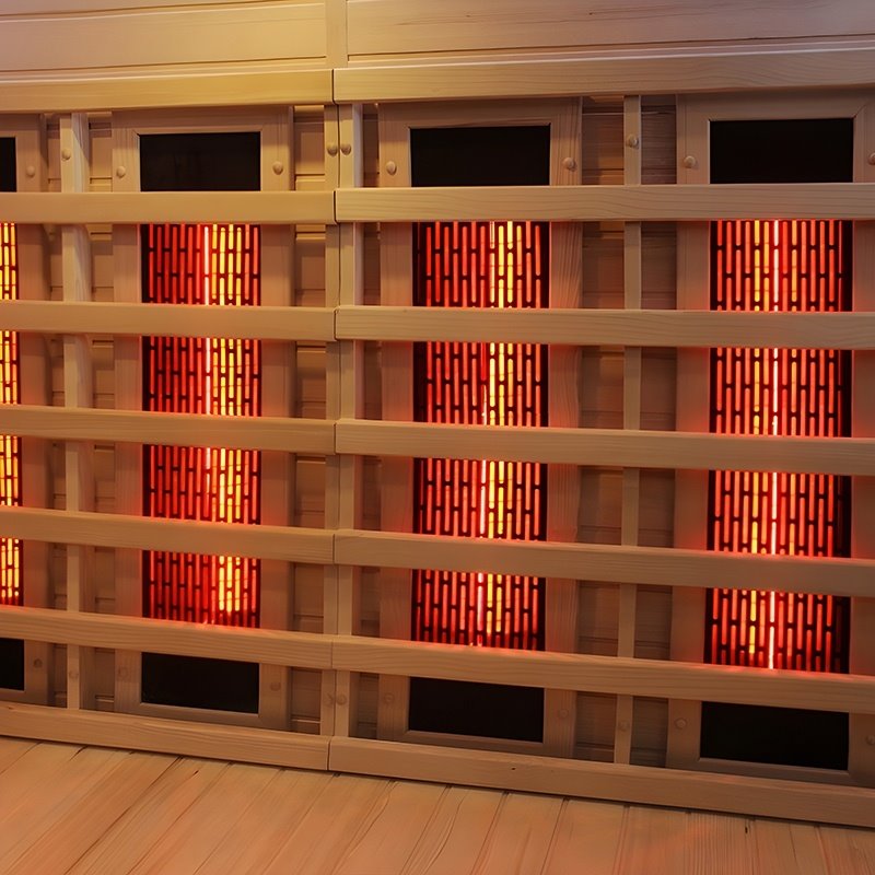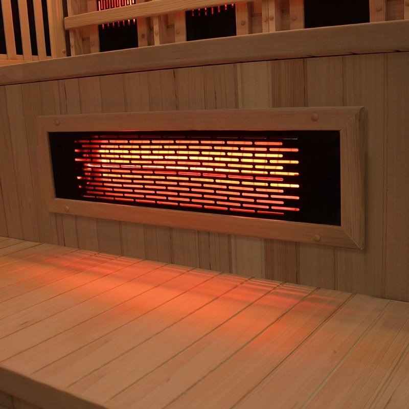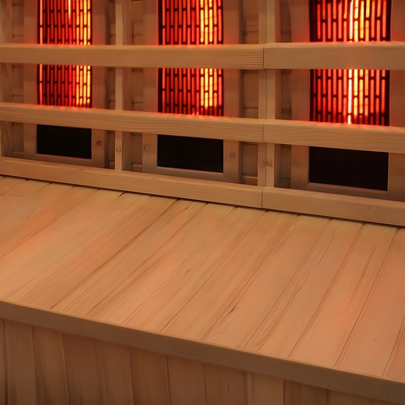 Konstrukcja sauny wykonana jest z wysokiej jakości drewna jodłowego z Kanady, które zapewnia trwałość, stabilność i przyjemny, naturalny klimat wewnątrz kabiny. Przemyślane rozmieszczenie siedzisk pozwala wygodnie ułożyć się podczas seansu, a eleganckie wykończenie sprawia, że sauna dobrze prezentuje się w nowoczesnych domowych wnętrzach.