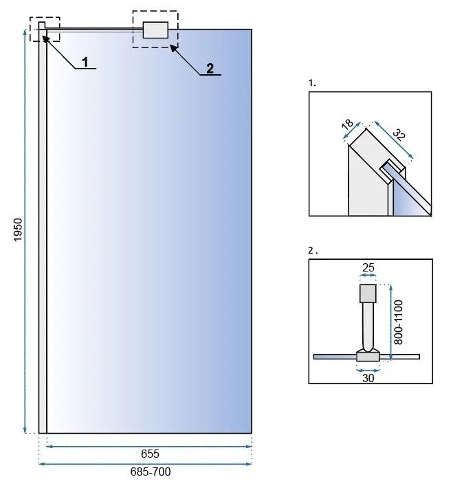 - Szkło hartowane bezpieczne 8 mm, transparentne co optycznie nie zabiera przestrzeni w łazience .W zestawie wspornik konstrukcji, mocowany do ściany lub sufitu z regulacją od 80 do 110 cm.