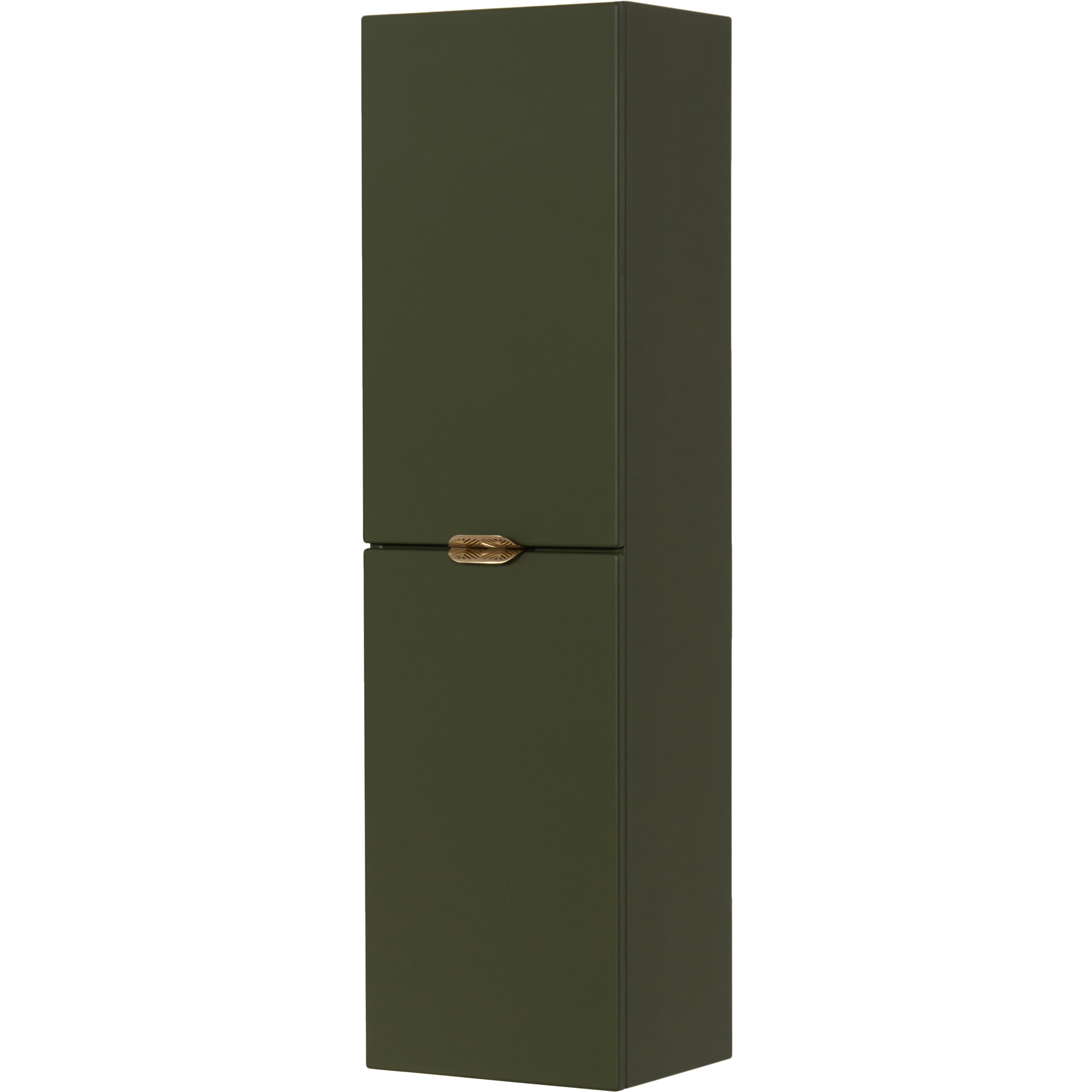 Wiszący dwudrzwiowy regał łazienkowy w bardzo eleganckim oliwkowym kolorze. Zestawienie złotych zdobionych uchwytów z oryginalną zielenią stanowi modne połączenie kolorystyczne nadając łazience osobliwego charakteru, która będzie się wyróżniać na tle innych łazienek. Kolorystyka oraz design sprawiają, że słupek przypadnie do gustu osobom, które chcą urządzić swoje wnętrze zarówno w klasycznym jak i bardziej nowoczesnym stylu.