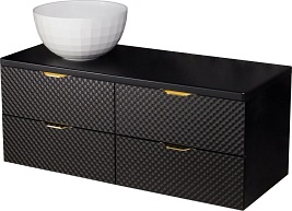 Szafka łazienkowa 120 cm z serii Glow, wykończona czarną folią matową i aż czterema szufladami o frontach ze szkła hartowanego w wariancie ze uchwytami w barwie starego złota to nie tylko piękny, ale przede wszystkim funkcjonalny mebel do większej łazienki wykończonej w nowoczesnym stylu. Ciche domykanie, precyzyjne wykonanie i niezwykłej urody materiały sprawiają, że jest to propozycja rzucająca się w oczy, czarująca niezwykłą urodą i urzekająca funkcjonalnością, której często brakuje designerskim meblom. Biała, dolomitowa umywalka utrzymana w ciekawej stylistyce stanowi znakomite dopełnienie całości.