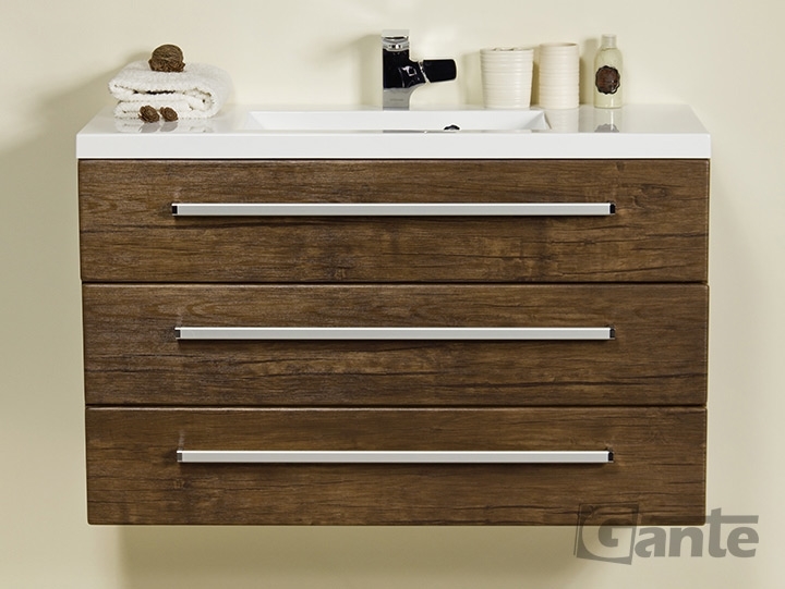 Nowoczesna, bardzo ekskluzywna szafka łazienkowa w kolorze antycznego drewna wraz z białą, dolomitową umywalką z serii FOKUS. Szafka posiada trzy szuflady. Umywalka posiada otwór na baterię.