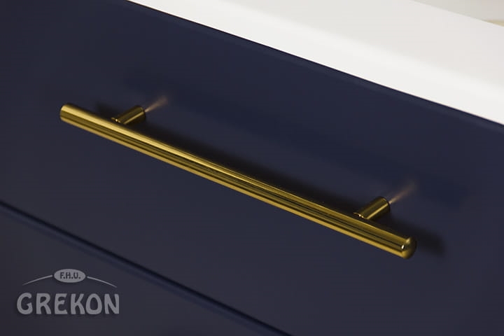 Duża szafka łazienkowa to podstawowy mebel każdej nowoczesnej łazienki, nie wspominając nawet o pokoju kąpielowym. Szerokość 80 centymetrów pozwala już na osiągnięcie naprawdę bardzo wysokiego poziomu komfortu, a ponieważ w serii Belli Gold umieściliśmy także bardzo nietypową stylistycznie opcję, będzie to świetne rozwiązanie do nowoczesnych wnętrz. Mowa o szafce w kolorze głębokiego granatu z matowym wykończeniem i szufladami ze złotymi uchwytami w formie niezbyt grubych relingów. Jest to arcyciekawa kombinacja kolorystyczna, a przy zachowaniu prostej bryły – co gwarantuje optymalne wykorzystanie dostępnego miejsca wewnątrz – pozwoliła na osiągnięcie przyciągającej wzrok stylizacji.