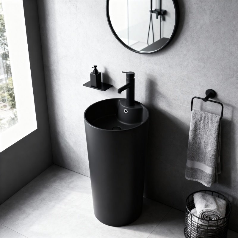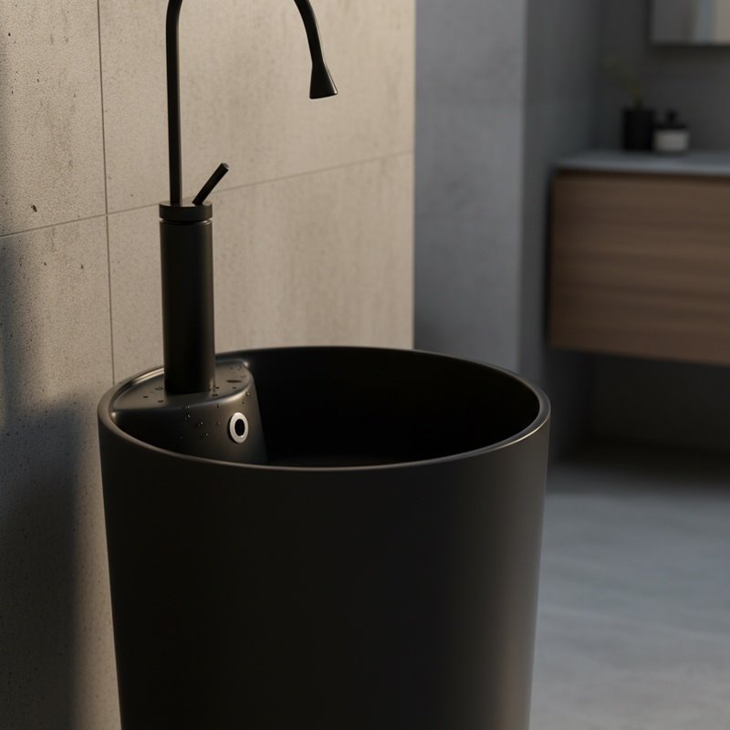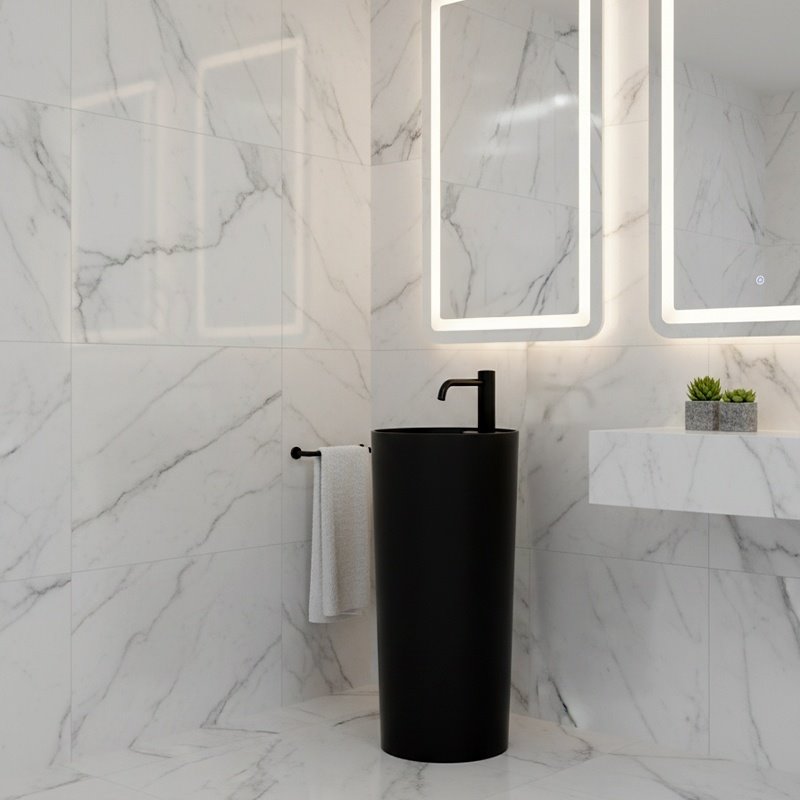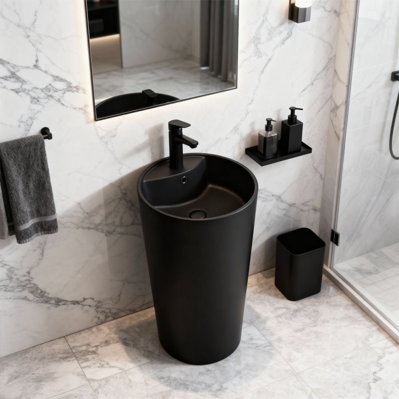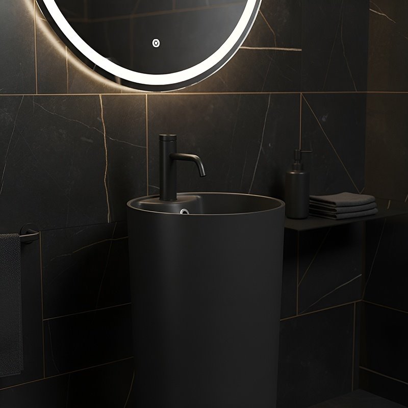 Klasyczna czerń nadaje umywalce elegancji i sprawia, że świetnie komponuje się zarówno z nowoczesnymi wnętrzami, jak i bardziej stonowanymi, ponadczasowymi aranżacjami.