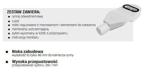 - w zestawie : rynna odwodnieniowa, miedź szczotkowana, regulowane nóżki, membrana uszczelniająca, niski syfon z polipropylenu, instrukcja montażu