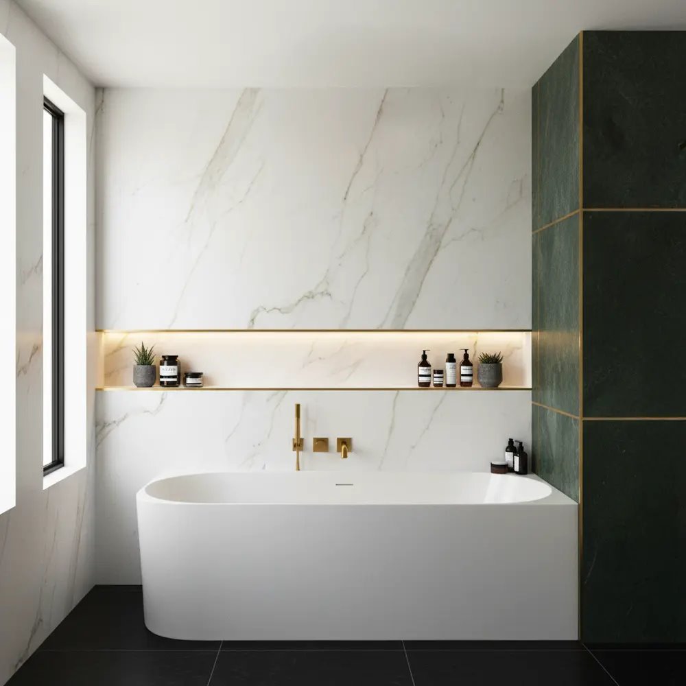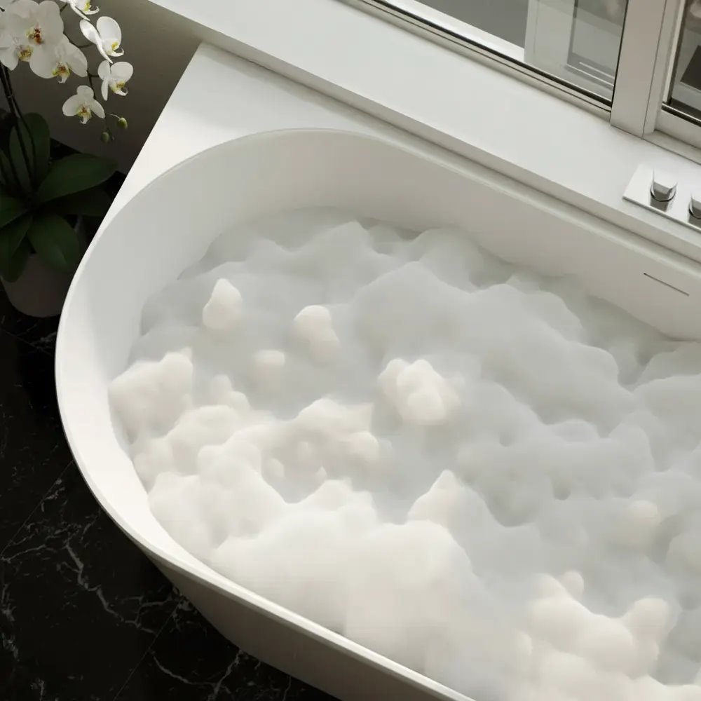 Precyzyjne linie, delikatne zaokrąglenia i subtelne wykończenie sprawiają, że wanna pełni nie tylko funkcję użytkową, ale także dekoracyjną, stając się wyraźnym elementem aranżacji.