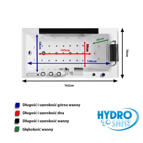 Opis produktu Wanna z hydromasażem prostokątna 162x75 cm Gomera 938C Hydrosan