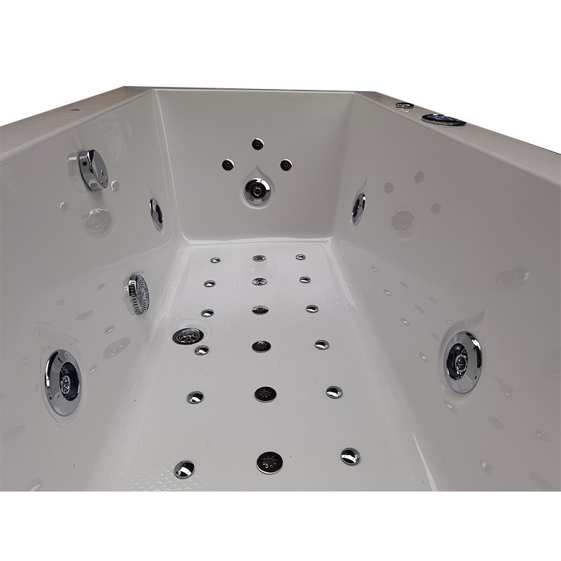 Model Ramona 640-180x90 wyposażono w zaawansowany system hydromasażu, który wykorzystuje różnorodne dysze do stworzenia pełnej, indywidualnie dostosowanej terapii wodnej. Dysze Hydro Jet, ukierunkowane na masaż pleców, dostarczają intensywnego, kojącego strumienia wody, przynosząc ulgę zmęczonym mięśniom, wspierając regenerację i zapewniając głęboki relaks.