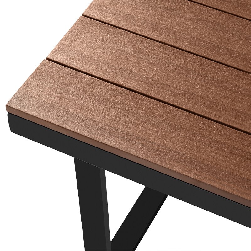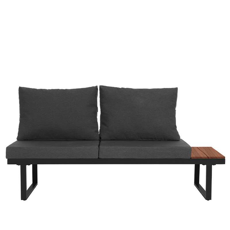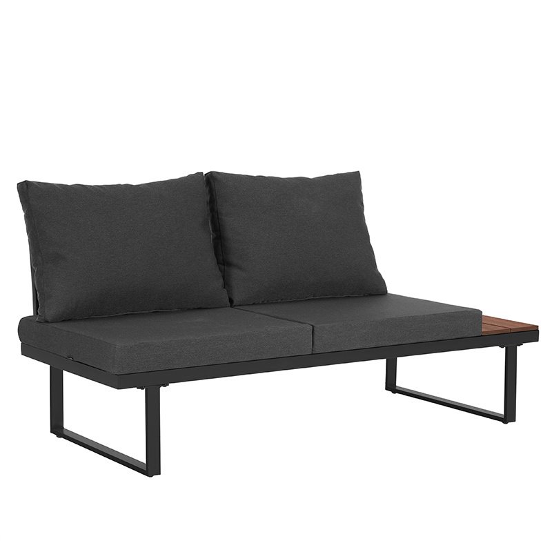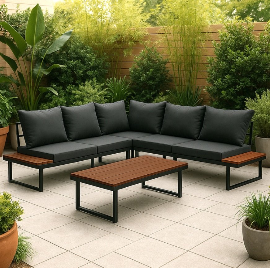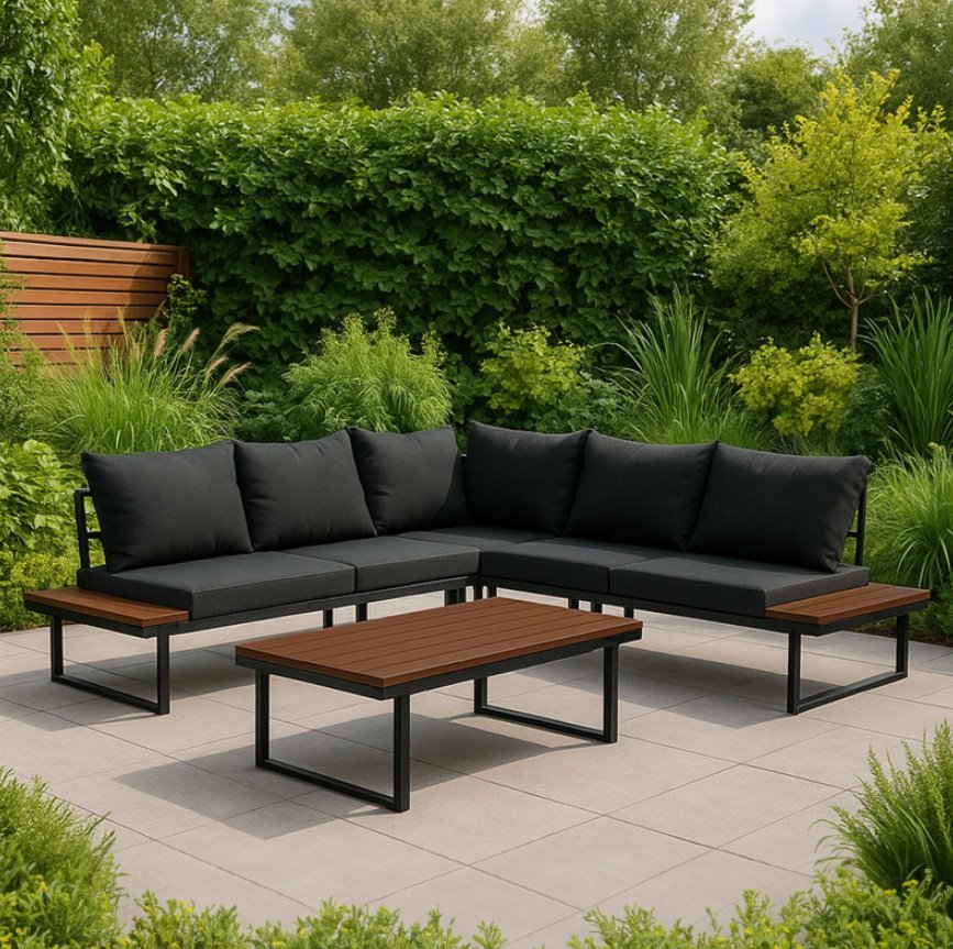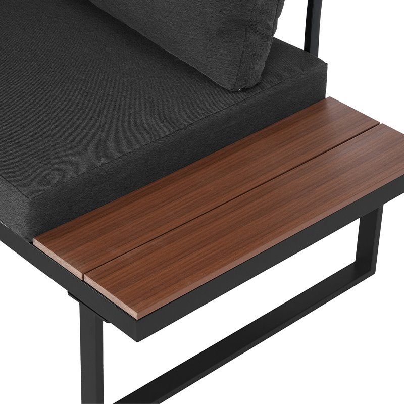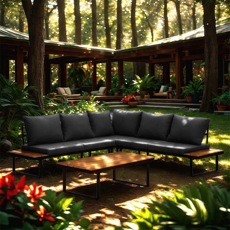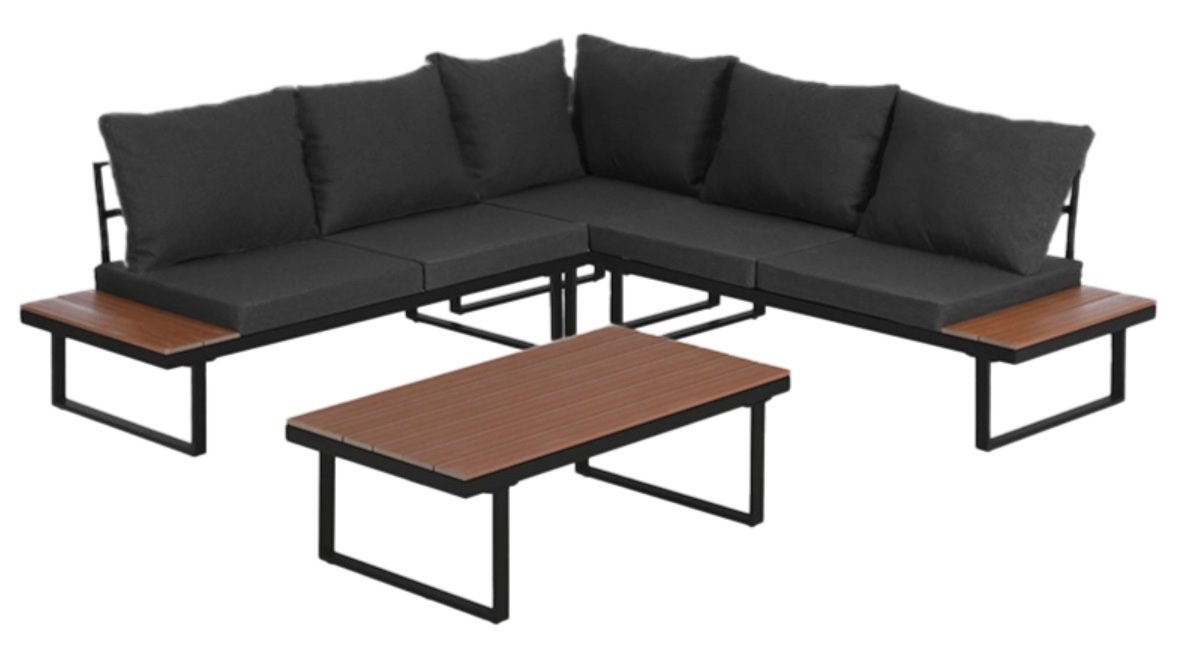 Zestaw ogrodowy VELACO TOBA-BL-WD1 – nowoczesna forma i wygoda użytkowaniaKomplet mebli ogrodowych VELACO TOBA-BL-WD1 to przemyślane połączenie minimalistycznego designu, funkcjonalności i trwałości. Narożny układ oparty na dwóch symetrycznych sofach połączonych modułem narożnym tworzy komfortową przestrzeń wypoczynkową dla 5 osób. Całość została uzupełniona o elementy w dekorze drewna – widoczne na blacie stolika oraz bocznych panelach – które przełamują surowość konstrukcji i nadają zestawowi bardziej przytulny charakter.