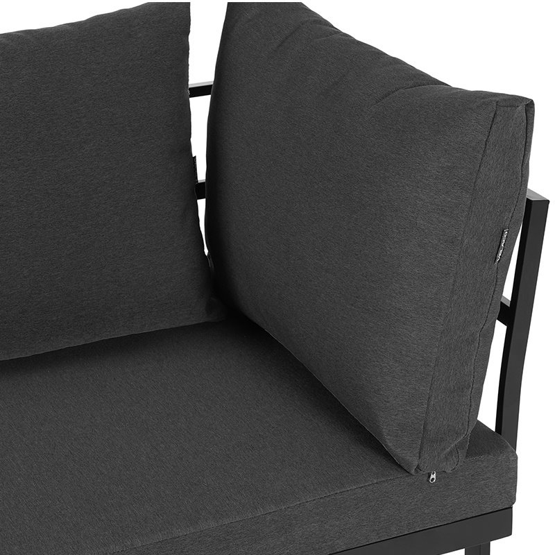 Metalowy stelaż w połączeniu z miękkimi poduchami tworzy wygodną przestrzeń do wypoczynku, jednocześnie zachowując lekkość wizualną całego zestawu.
