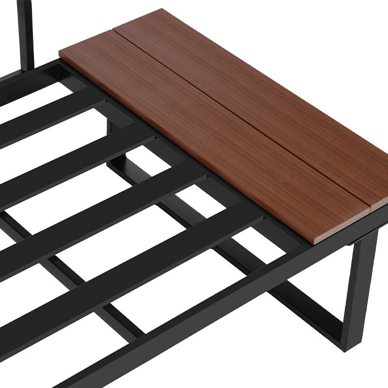 Stelaż wykonany ze stali malowanej proszkowo zapewnia stabilność oraz odporność na korozję i uszkodzenia mechaniczne. Matowe, czarne wykończenie podkreśla nowoczesny charakter zestawu i dobrze komponuje się z różnymi aranżacjami ogrodowymi.