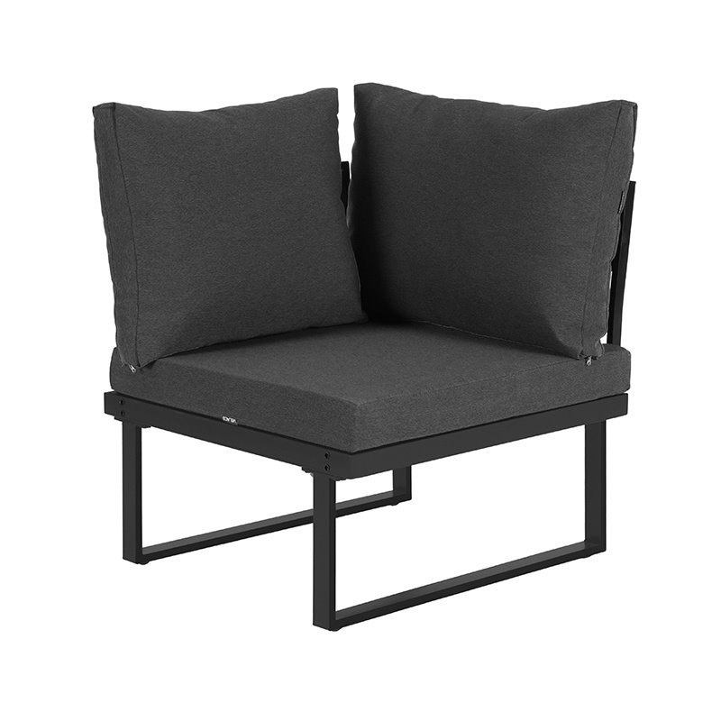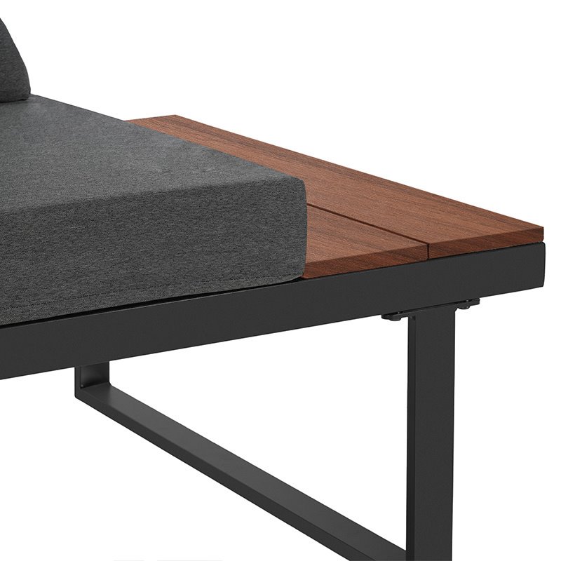 Zestaw tworzy spójną, geometryczną kompozycję w kształcie kąta prostego. Takie rozwiązanie sprzyja wygodnemu rozmieszczeniu użytkowników i sprawdza się zarówno podczas codziennego relaksu, jak i spotkań w większym gronie.