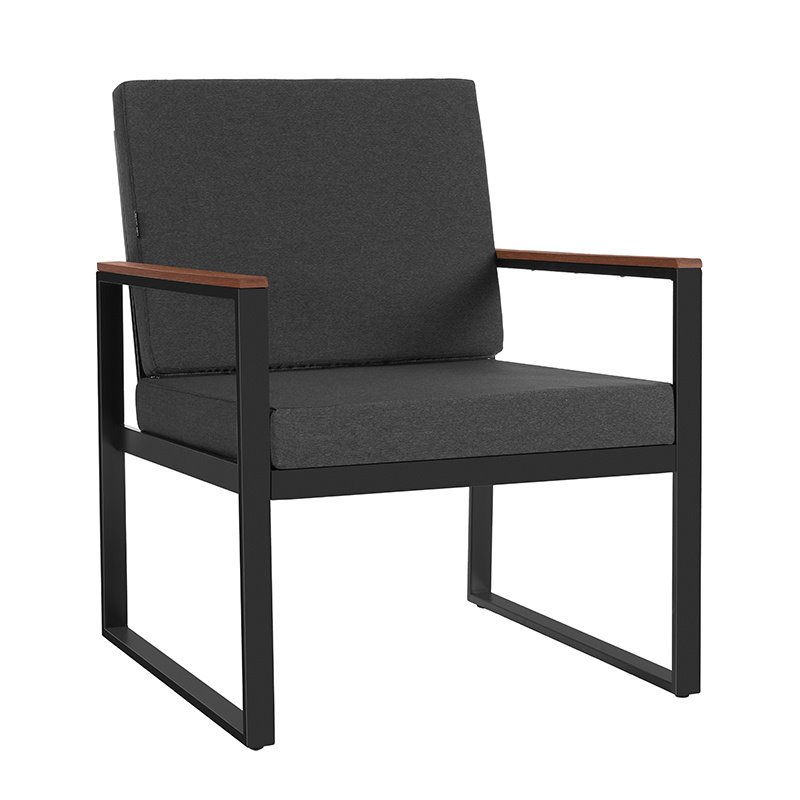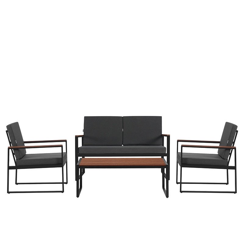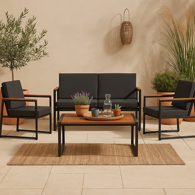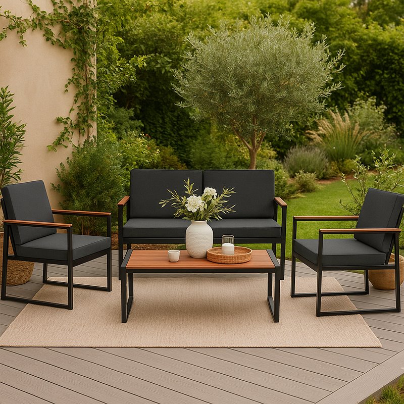 Zestaw ogrodowy VELACO CARTER-BL-WD1 – nowoczesna prostota i funkcjonalnośćModel CARTER-BL-WD1 marki VELACO to propozycja dla osób, które cenią minimalistyczny design i wygodę użytkowania. Zestaw dla 4 osób sprawdzi się zarówno na tarasie, balkonie, jak i w ogrodzie, tworząc spójną i estetyczną strefę wypoczynku. Połączenie czarnej, stalowej konstrukcji z elementami w dekorze drewna nadaje całości nowoczesny, ale jednocześnie bardziej przytulny charakter.