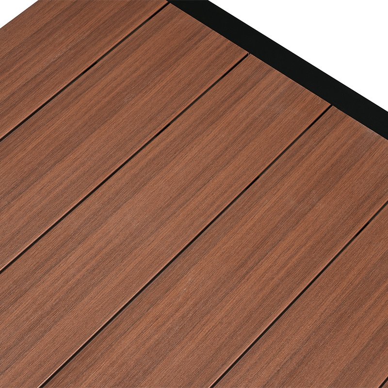 Blat stolika oraz podłokietniki zostały wykończone materiałem imitującym naturalne drewno. Elementy te są odporne na wilgoć i łatwe w czyszczeniu, a przy tym wizualnie ocieplają całą konstrukcję.