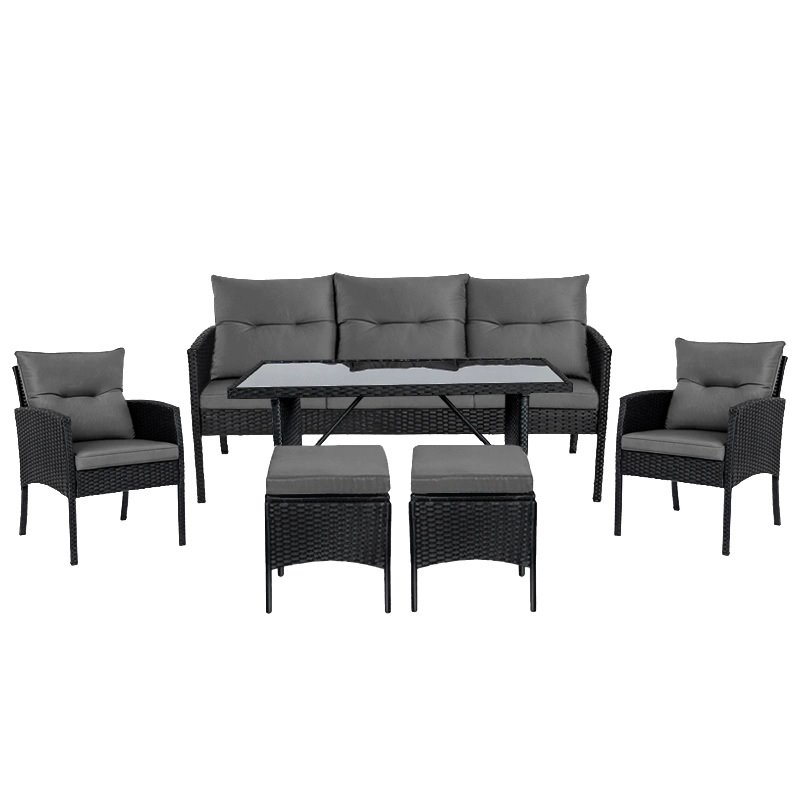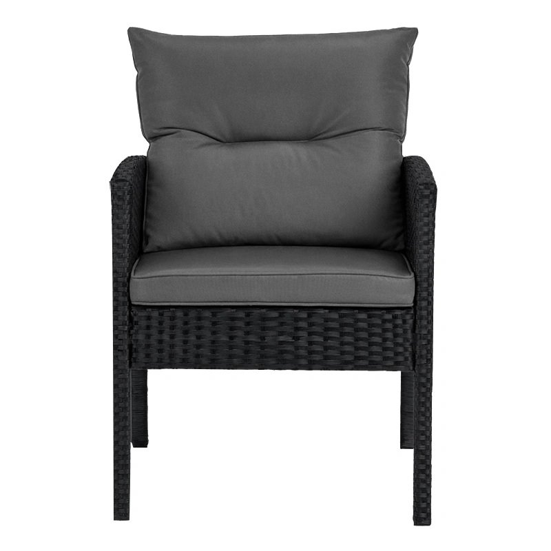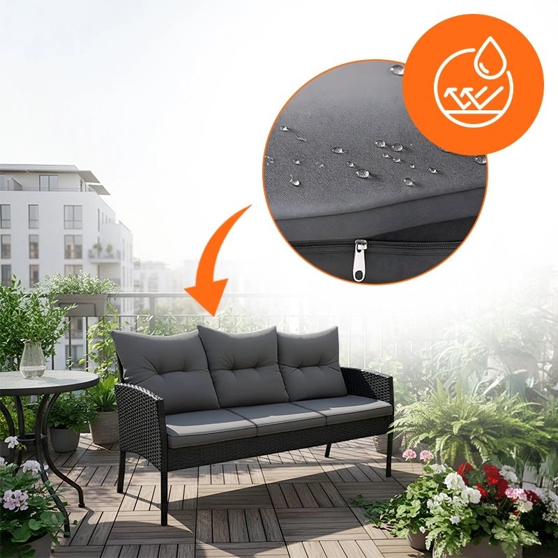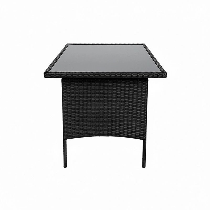 Plecionka z technorattanu nadaje meblom nowoczesny, lekki wygląd, a przy tym jest odporna na promieniowanie UV i zmienne warunki atmosferyczne. Dzięki temu zestaw zachowuje estetykę przez cały sezon bez wymagającej pielęgnacji.
