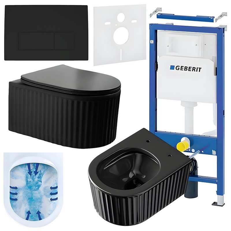 Opis produktu Zestaw podtynkowy stelaż GEBERIT DUOFIX + miska LUMA-BL-RIM-03 + przycisk DELTA 50 czarny mat