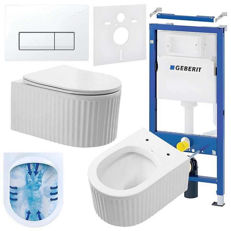 Dużą zaletą zestawu jest zastosowana technologia Rimless. Bezkołnierzowa konstrukcja sprawia, że woda podczas spłukiwania rozprowadza się równomiernie po całym wnętrzu miski, skutecznie usuwając zabrudzenia i eliminując miejsca, w których mogłyby gromadzić się bakterie. To rozwiązanie zwiększa higienę, ogranicza powstawanie osadów i ułatwia utrzymanie toalety w idealnym stanie.