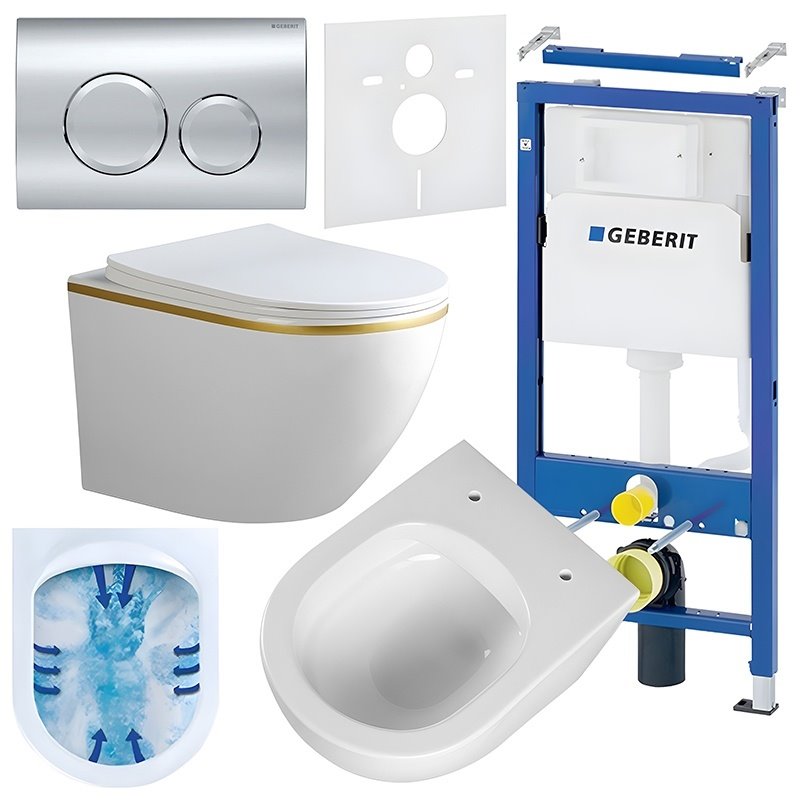 Dużą zaletą zestawu jest zastosowana technologia Rimless. Bezkołnierzowa konstrukcja sprawia, że woda podczas spłukiwania rozprowadza się równomiernie po całym wnętrzu miski, skutecznie usuwając zabrudzenia i eliminując miejsca, w których mogłyby gromadzić się bakterie. To rozwiązanie zwiększa higienę, ogranicza powstawanie osadów i ułatwia utrzymanie toalety w idealnym stanie.