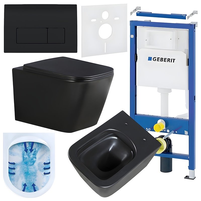 Opis produktu Zestaw podtynkowy stelaż GEBERIT DUOFIX + miska RAIN-MTB-RIM-03 + przycisk DELTA 50 czarny połysk