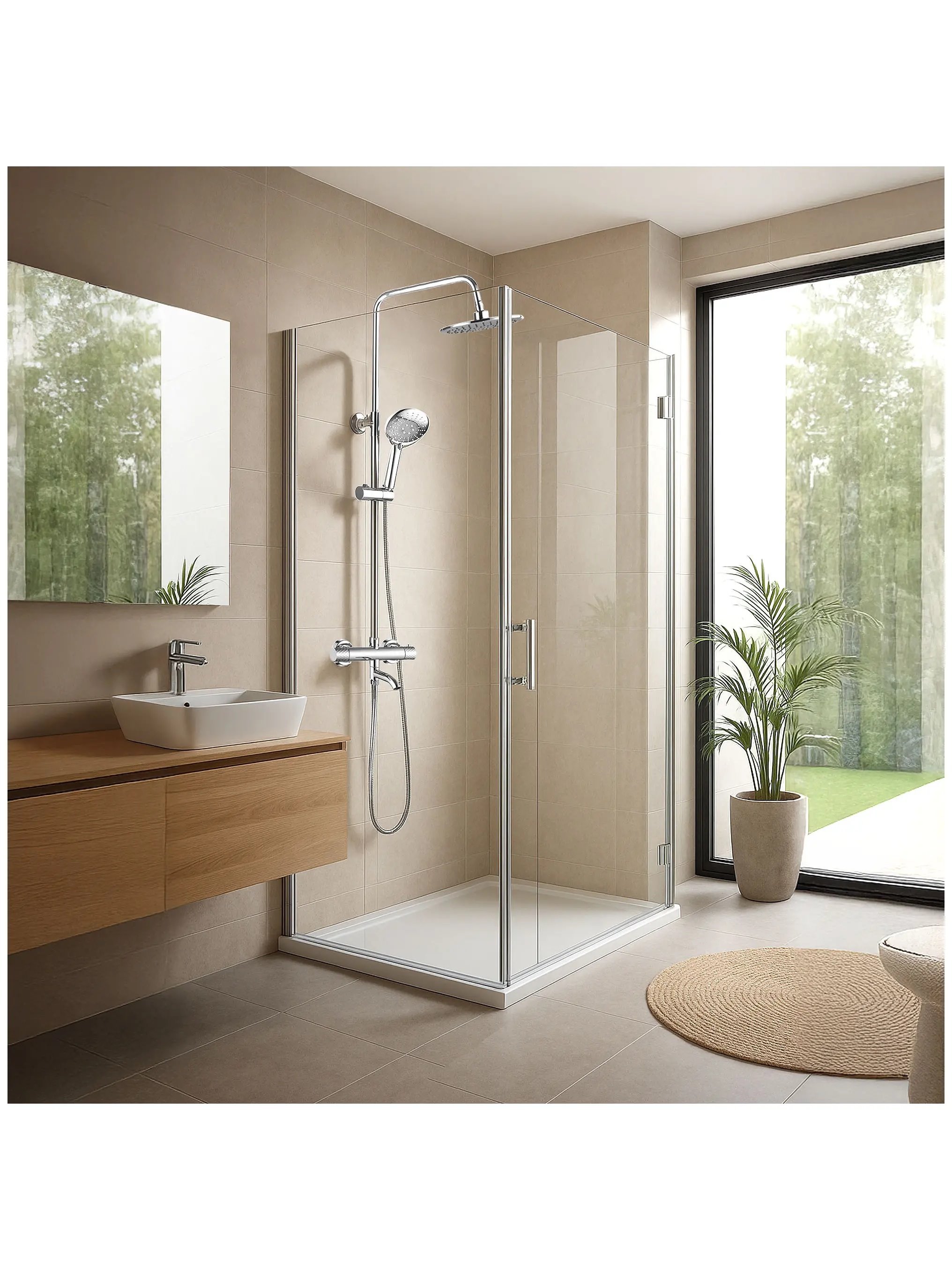 Całość wykonano z najwyższej jakości materiałów, a powierzchnia pokryta została 4-warstwową powłoką ochronną, odporną na korozję, przebarwienia i zarysowania. Termostat gwarantuje stabilną temperaturę wody i bezpieczeństwo użytkowania, a ultra deszczownica zapewnia równomierny, relaksujący strumień wody. W skład zestawu wchodzi również bateria z elementami montażowymi, wąż prysznicowy, słuchawka oraz wylewka, co czyni go kompletnym rozwiązaniem do każdej łazienki.