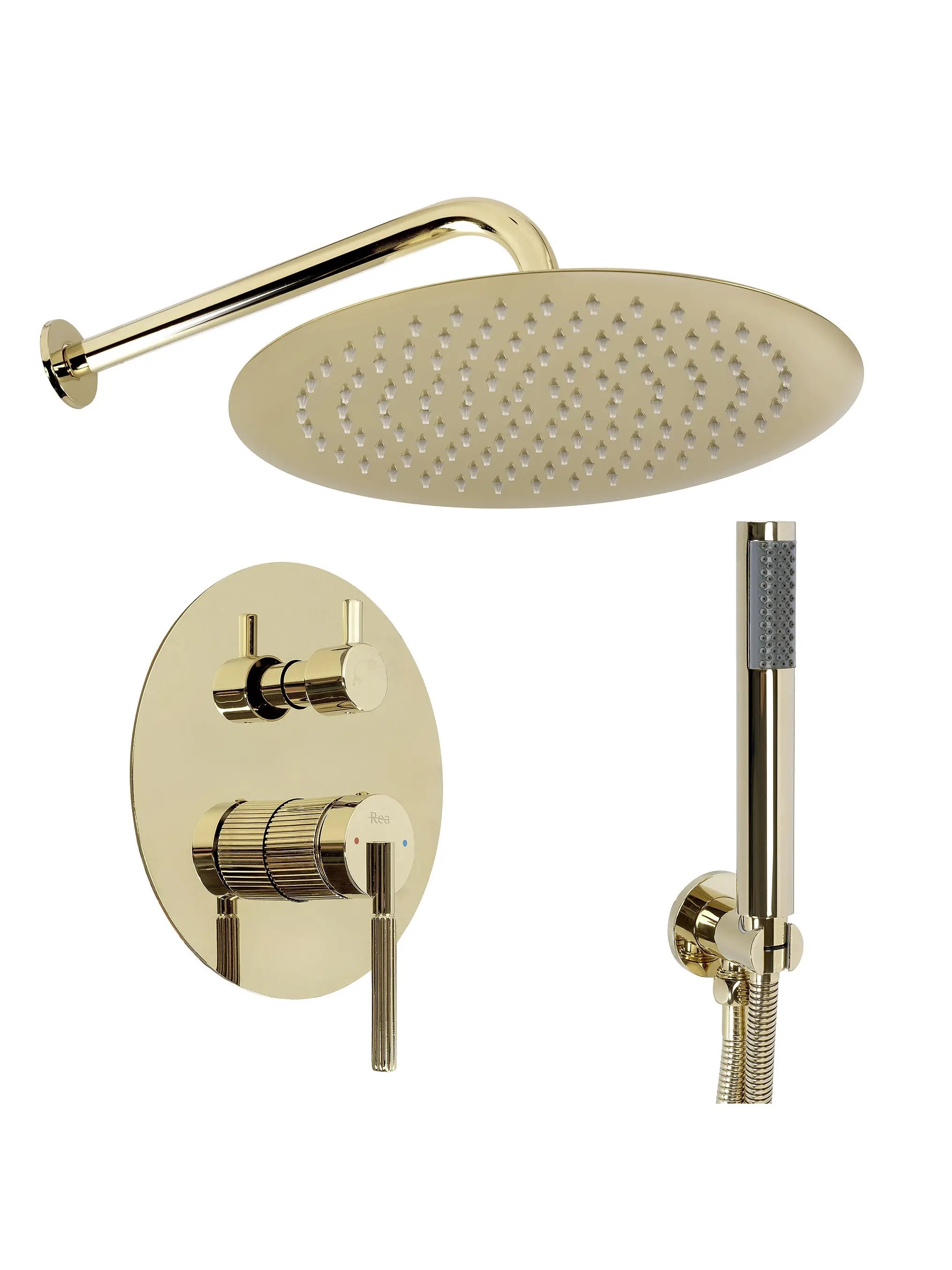 Zestaw prysznicowy podtynkowy Rea Agron Złoty Połysk to połączenie elegancji, nowoczesnego designu i najwyższej jakości wykonania. Jego minimalistyczna forma z subtelnymi ryflowaniami wprowadza do łazienki wyjątkowy charakter, tworząc harmonijną równowagę między funkcjonalnością a estetyką.